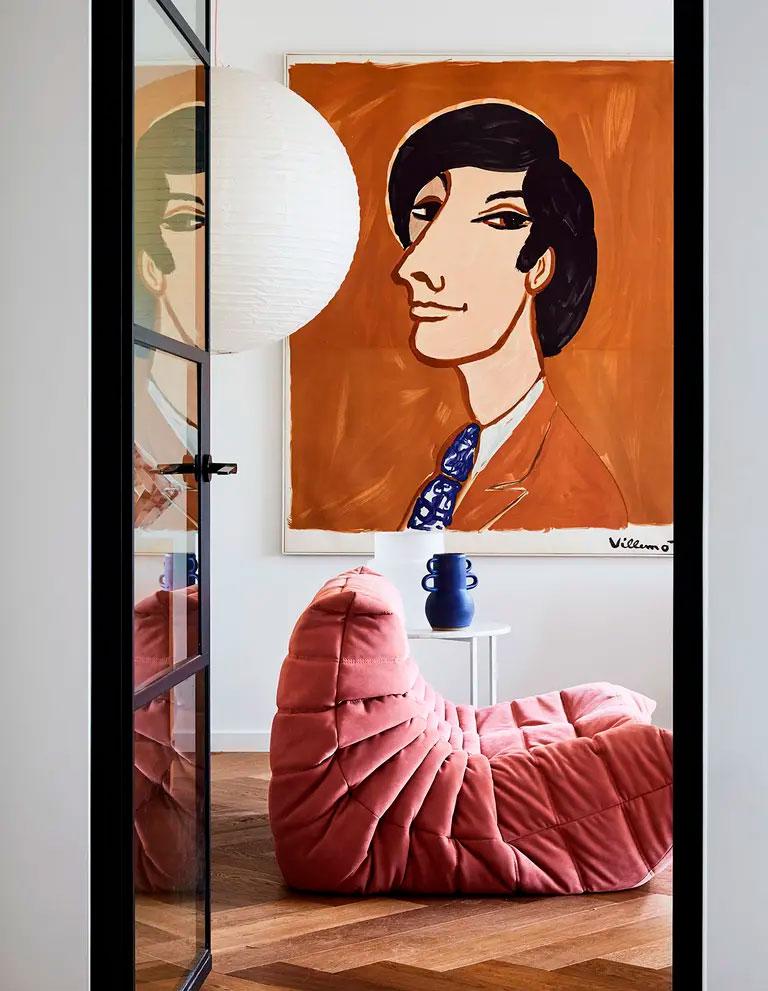 El salón es toda una declaración de intenciones, no tengo claro quién tiene más protagonismo si los sofás rosas Togo de Domo, o las láminas de Vintage Posters Only. Se complementan con una bonita alfombra de la marca KosKela y una original mesa de centro de Mark Tuckey.