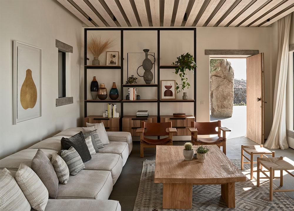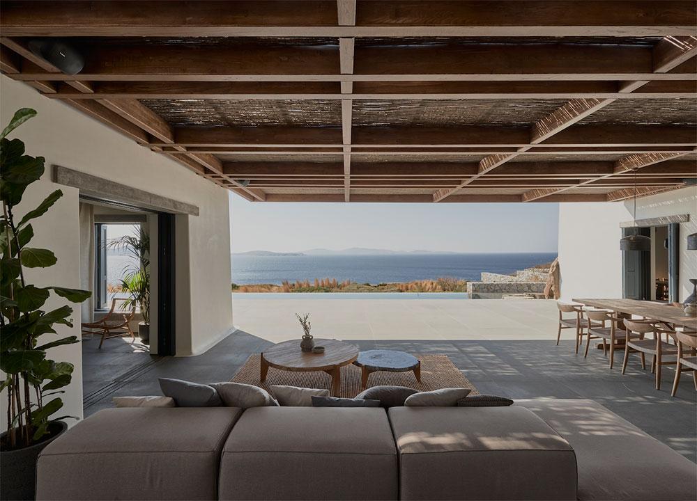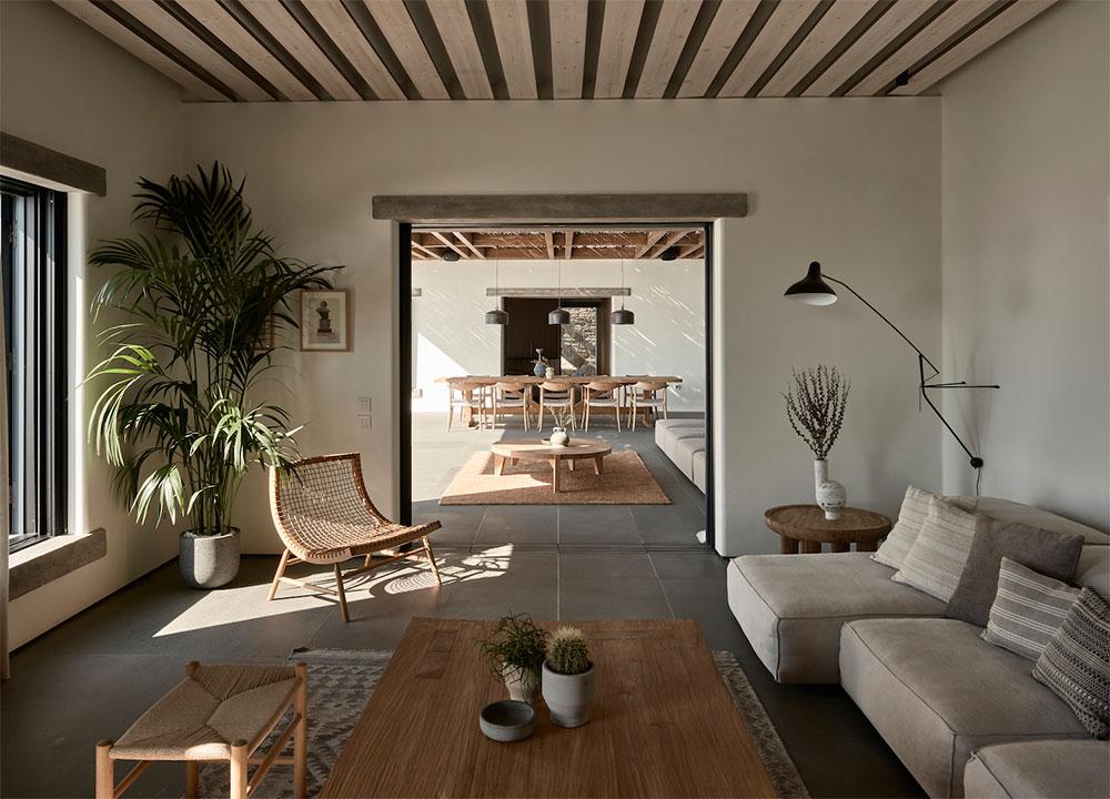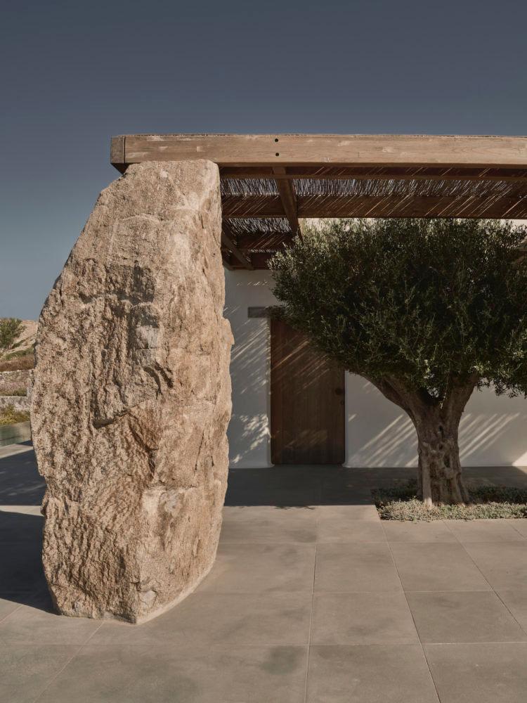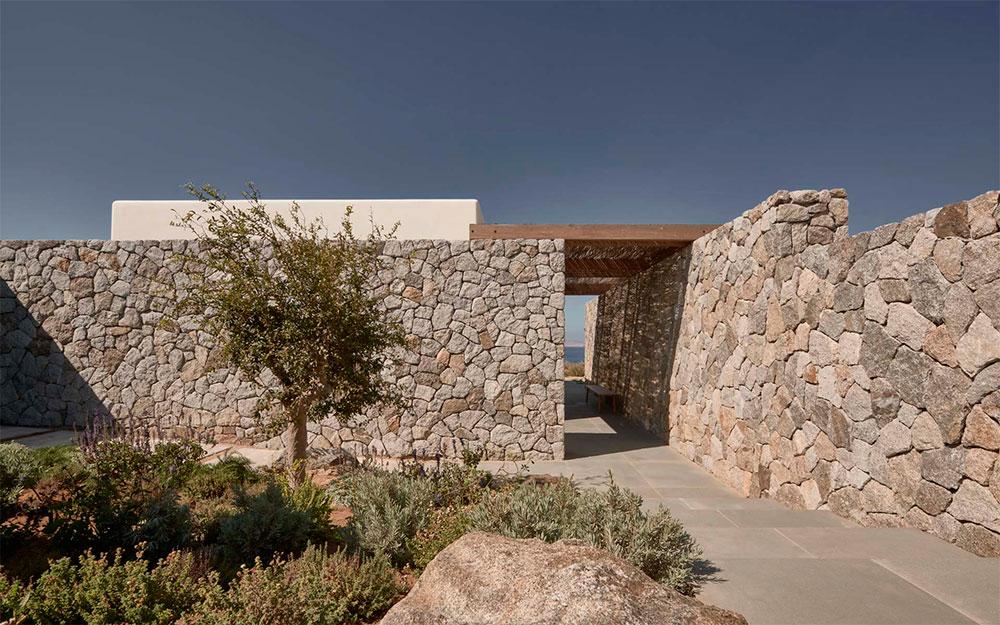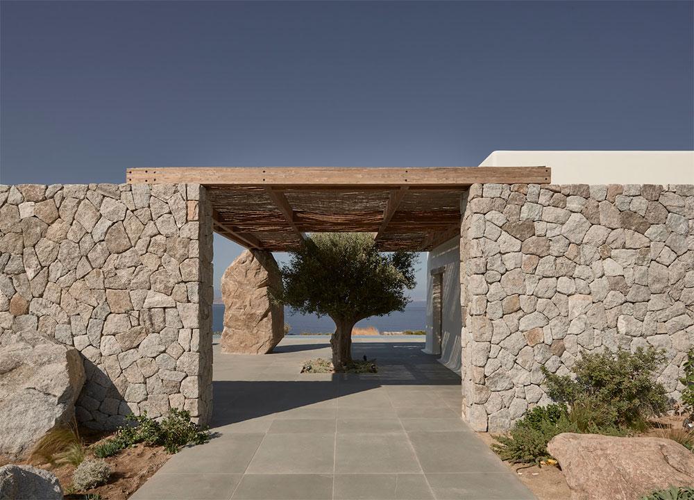 Se trata de Villa Mandra, y como os he contado, se encuentra en la isla griega de Mykonos. Realizada por el estudio de arquitectura K-Studio para una familia de seis miembros como vivienda vacacional. La casa fue construida con la filosofía del movimiento “slow“, está hecha para el disfrute y relajación de cada miembro de la familia. Se construyó con elementos y técnicas tradicionales de la zona, como los muros de piedra artesanal que se combinan con paredes encaladas en blanco, creando bonitos volúmenes. Las pérgolas de madera y caña, hacen de unión y entran a formar parte del juego de materiales.