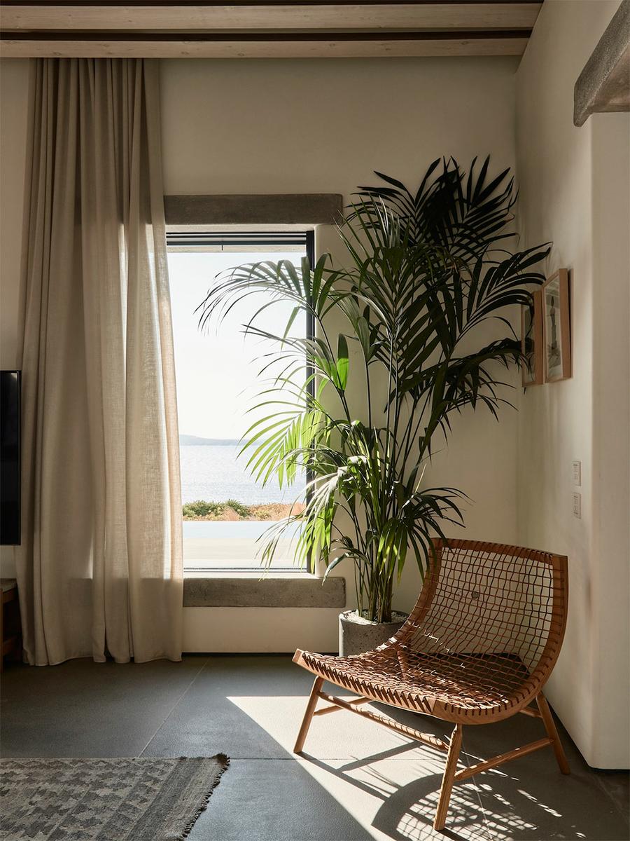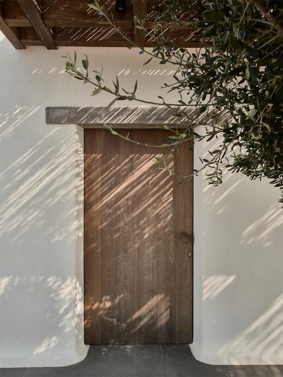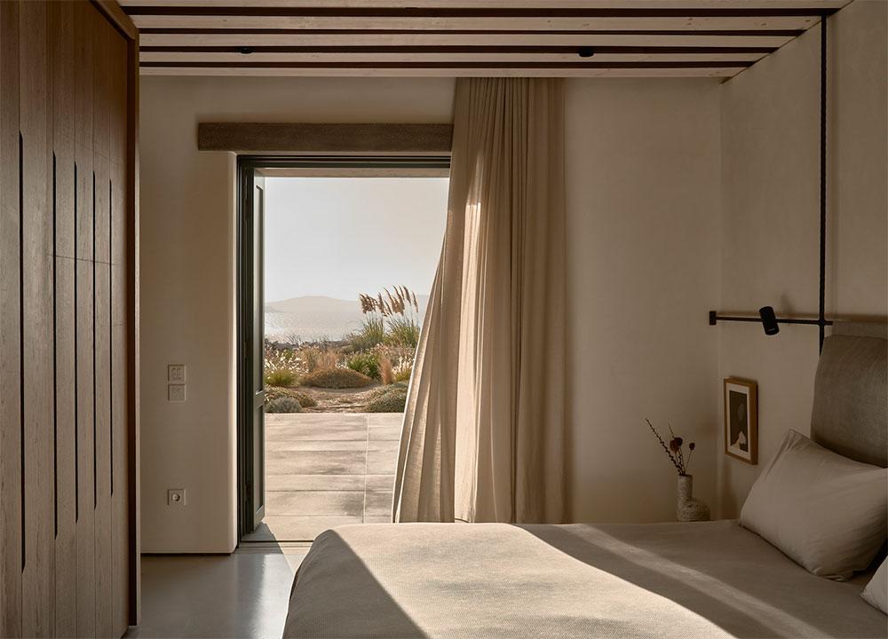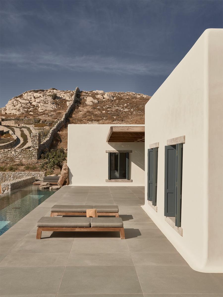 Se trata de Villa Mandra, y como os he contado, se encuentra en la isla griega de Mykonos. Realizada por el estudio de arquitectura K-Studio para una familia de seis miembros como vivienda vacacional. La casa fue construida con la filosofía del movimiento “slow“, está hecha para el disfrute y relajación de cada miembro de la familia. Se construyó con elementos y técnicas tradicionales de la zona, como los muros de piedra artesanal que se combinan con paredes encaladas en blanco, creando bonitos volúmenes. Las pérgolas de madera y caña, hacen de unión y entran a formar parte del juego de materiales.