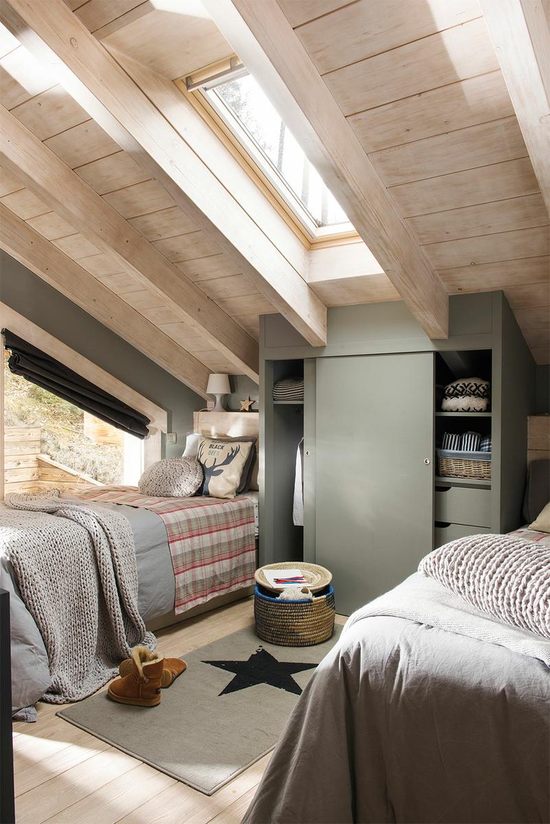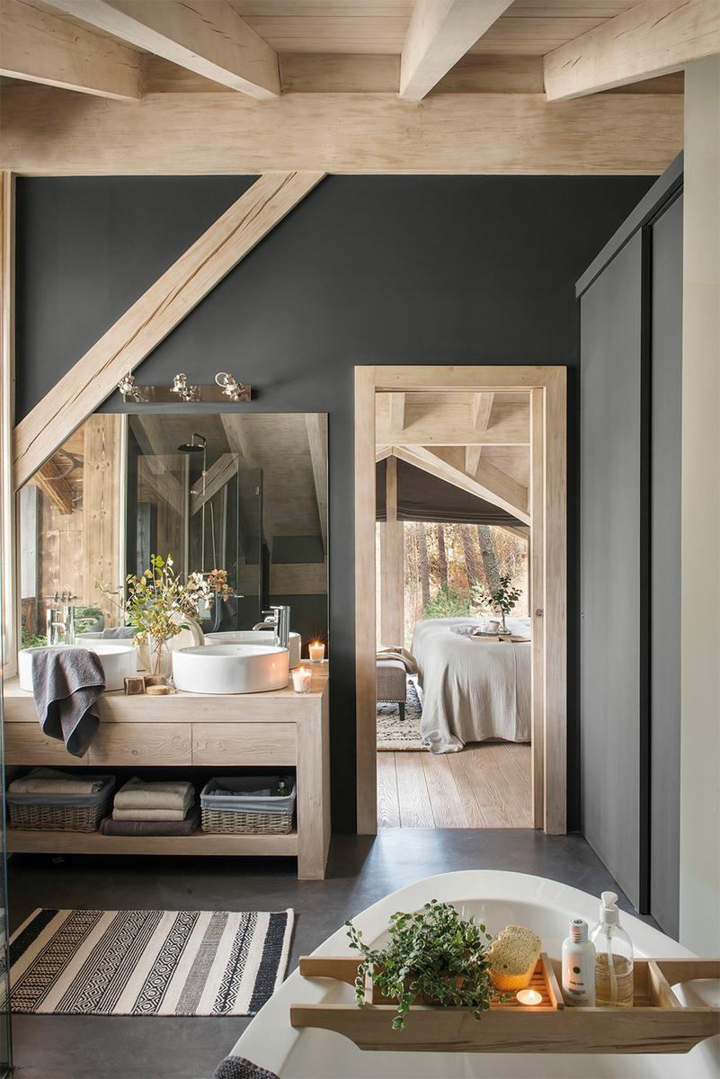 El dormitorio principal es como para no salir de la cama, un refugio. Si miras hacia arriba encuentras todo ese entramado de vigas de madera tan reconfortante y si te giras, te esperan las vistas al bosque, como para hibernar ¿no? Además posee su propia zona de estar con estufa y un baño en suite con el armario incorporado, todo siguiendo la misma estética que el resto de la vivienda.