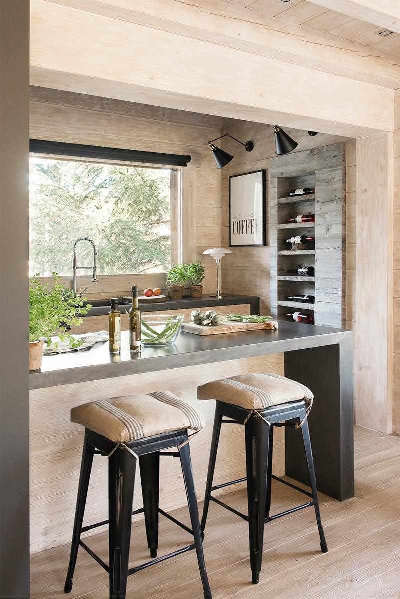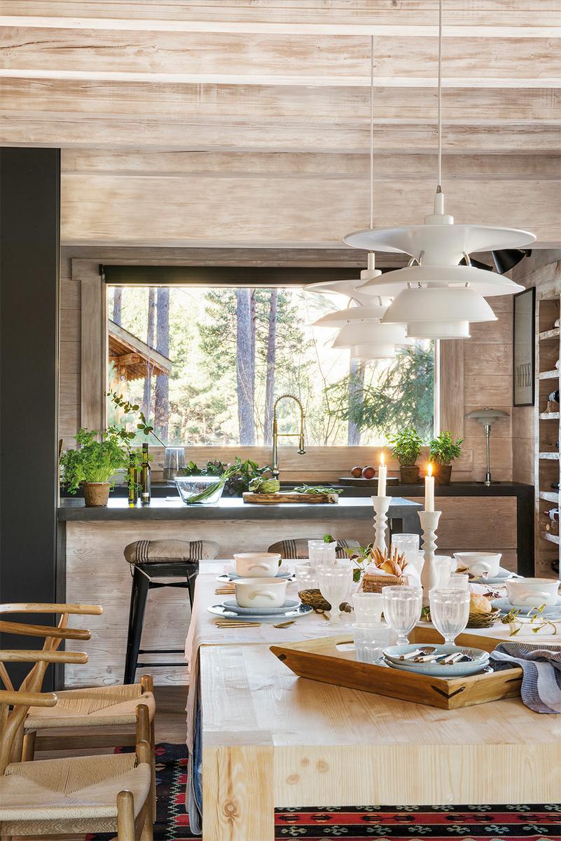La casa como es de suponer, es mayoritariamente de aspecto nórdico, aunque quisieron añadirle piezas de aquí y de allá, como la alfombra del recibidor que proviene de la India. Como el objetivo era disfrutar del exterior, la vivienda es de concepto abierto así comedor, salón y cocina conviven en un mismo espacio, donde además se dispusieron grandes ventanales para no perder de vista el bosque que les rodeaba. Muchos de los muebles así como la casa, fue construida por Vicenç Torrent con ayuda de su padre, constructor y también carpintero, la mesa de la cocina entre muchas otras, es una pieza suya. En esta, se combinó la madera con el microcemento en zonas como la encimera y la península, y en el frente de la nevera también se introdujo paredes de pizarra. El resultado es espectacular, es una de mis partes favoritas de la casa; una cocina pequeña en “U” donde no le falta ni diseño ni funcionalidad.