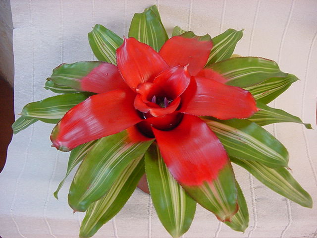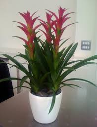 Guzmania: Es una planta tropical que tiene un centro rojo vivo, que de inicio nace verde. Esta necesita de riego constante ya que gracias a esto va tomando su color y forma pues necesita humedad un 95% del tiempo, no se debe exponerla directamente al sol.