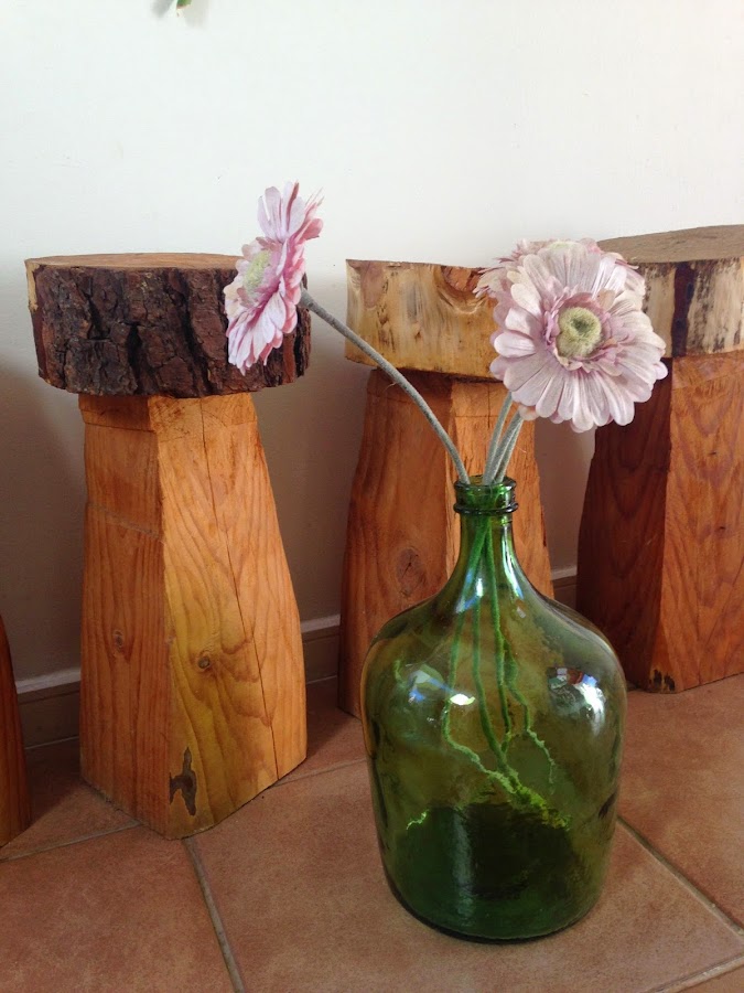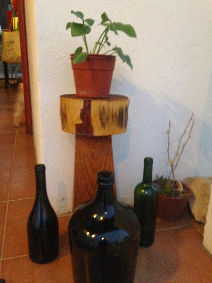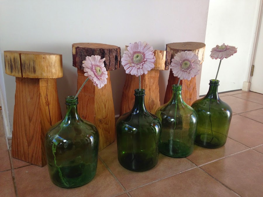 Y como toda locura tiende a extenderse, se me ocurrió mezclar mis bellas Damajuanas con botellas de vino o espumante en distintas formas y tonos verdes o café.
