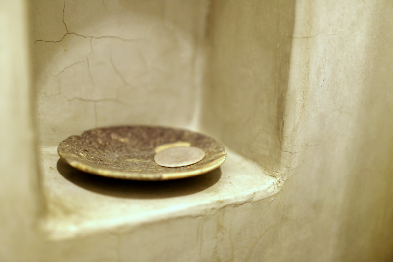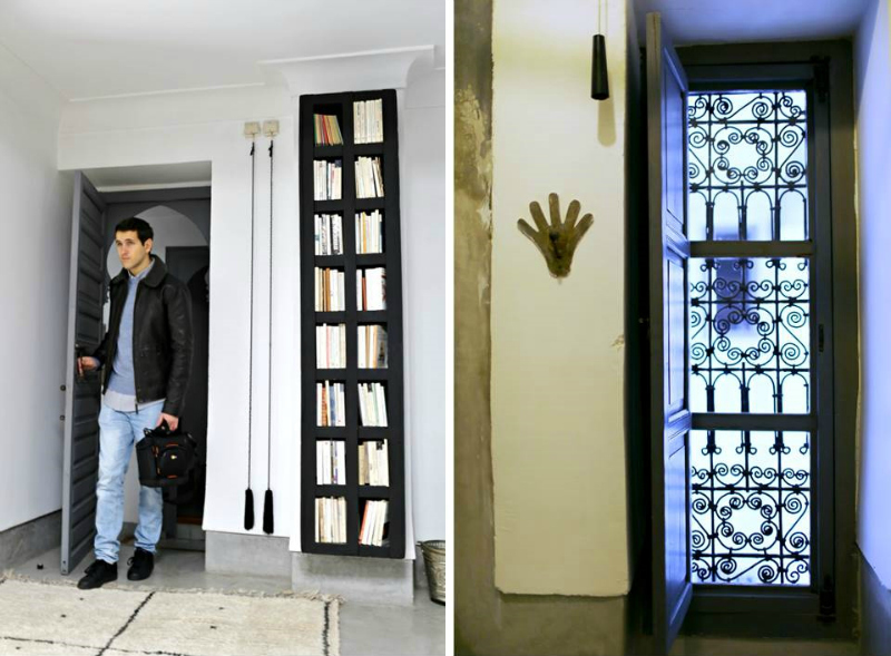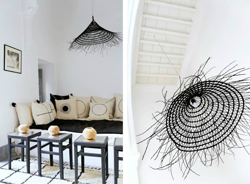 Tras la puerta de entrada, un sencillo recibidor lleno de detalles propios del país: asientos de troncos de palmera, valiosas alfombras bereber, sombreros de paja, ramas secas de flor de palmera y leña. Poco más es necesario para decorar este espacio donde el blanco de las paredes y el gris azulado de las imperfectas baldosas de cemento son realmente los protagonistas.