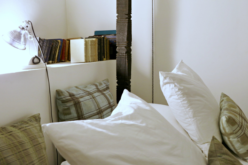 La pared del cabecero presenta una solución muy original para salvar el descuadre, creando un espacio que hace las veces de mesita de noche con libros y un flexo vintage.