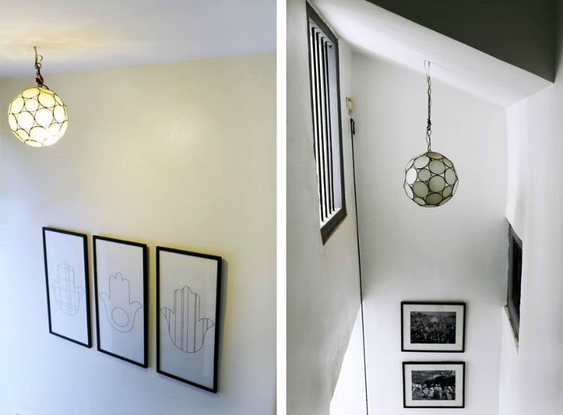 Como fuimos en Navidad, algunos toques de decoración festiva como el árbol esquemático en hierro en la pared, iluminado de noche con luces led, y portavelas de cristal con forma de estrellas colgando de los naranjos.