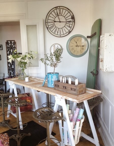 Aquí la tenéis como mesa de centro y de apoyo, me encanta la segunda imagen, una inspiración muy bonita para un taller.