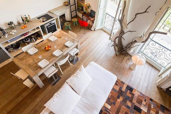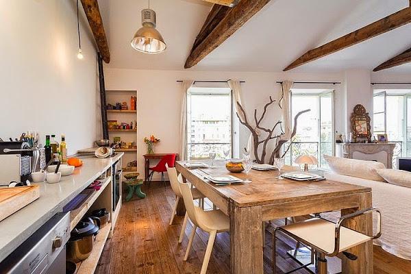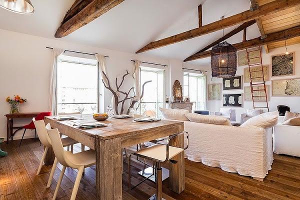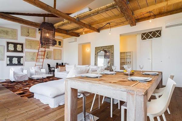 Os dejo con una vivienda entre rústica y bohemia, con una estética muy personal en blanco y madera natural, impecables tejidos de blanco algodón, bellos techos de vigas de madera y una sencilla y personal cocina de obra.