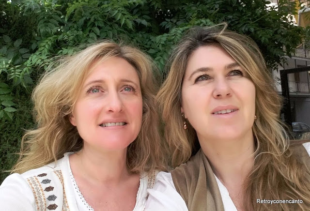 Nuestra primera idea fue cambiar un poco la estética del blog, pero con sutileza, pues nos identificamos mucho con su imagen; hemos aumentado un poco la letra (cosas de la presbicia, para el que la tenga...), cambiando la foto de acceso a la tienda, eliminado algunos gadgets para no agobiar, modificado los iconos de las redes sociales e incluyendo una foto nuestra en la página de inicio. Esta foto ha traído cola, pues no había forma de que saliéramos bien las dos, que si no me llega la mano para el selfie, yo sujeto el móvil y tú le das al botón, te has equivocado y le has dado al vídeo, ¿pa dónde estás mirando?, ¡hay que mirar aquí!... Y para muestra, un botón...