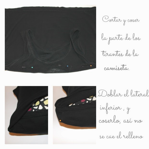 He aprovechado los laterales y el dobladillo de la camiseta, solo he tenido que coser la parte de arriba de los tirantes, y un dobladillo en los lados `para que no se escape el relleno.