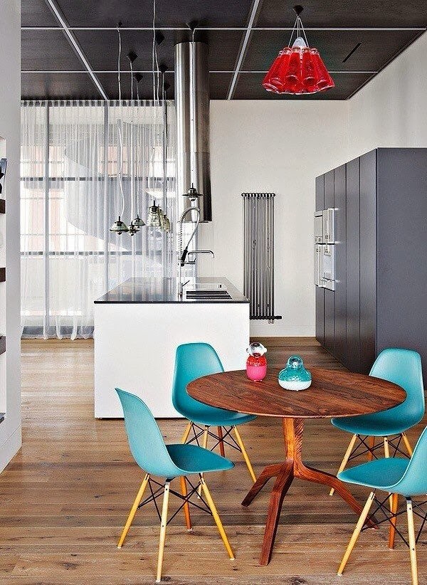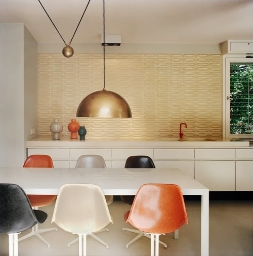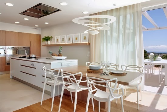 Hoy os traigo una selección de cocinas en las que las que la presencia de una o varías lámparas de marcado carácter confieren distinción al espacio, huelga decir que el resto de elementos decorativos contribuyen a esa distinción. Es importante saber respecto al diseño y amueblamiento de cocinas que lo más importante es que sean principalmente funcionales sin dejar de ser estéticas. Con líneas sencillas y muebles de presencia sutil acompañados de elementos decorativos, mesas, sillas o luminarias como las que os muestro podemos dar ese toque especial que deseamos sin renunciar a una cocina cómoda. Ahí es donde podemos dejar volar la imaginación y ser atrevidos...y obtener un resultado perfecto.