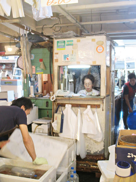 Nos llamaron muchísimo la atención estas pequeñas cabinitas ubicadas detrás de cada puesto donde se lleva la contabilidad, por regla general son mujeres con apenas espacio para moverse entre ristras de cuentas negociando toneladas de pescado.......