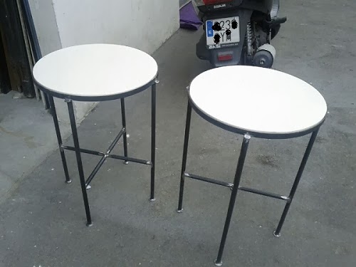 Y aquí no acaba la cosa, porque las mesitas laterales del sofá tampoco nos encajaban entre las que vimos en las tiendas, unas por el tamaño, otras por el color y otras sencillamente eran impagables. Sacamos un diseño ligero, en hierro trabajado y con piedra caliza sin pulir, algo especial y a la vez único, que lo dejamos en manos de Charlie de ( Solmad.)