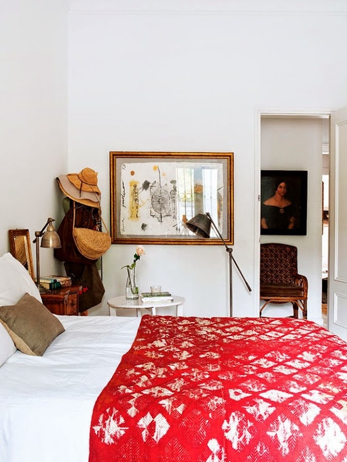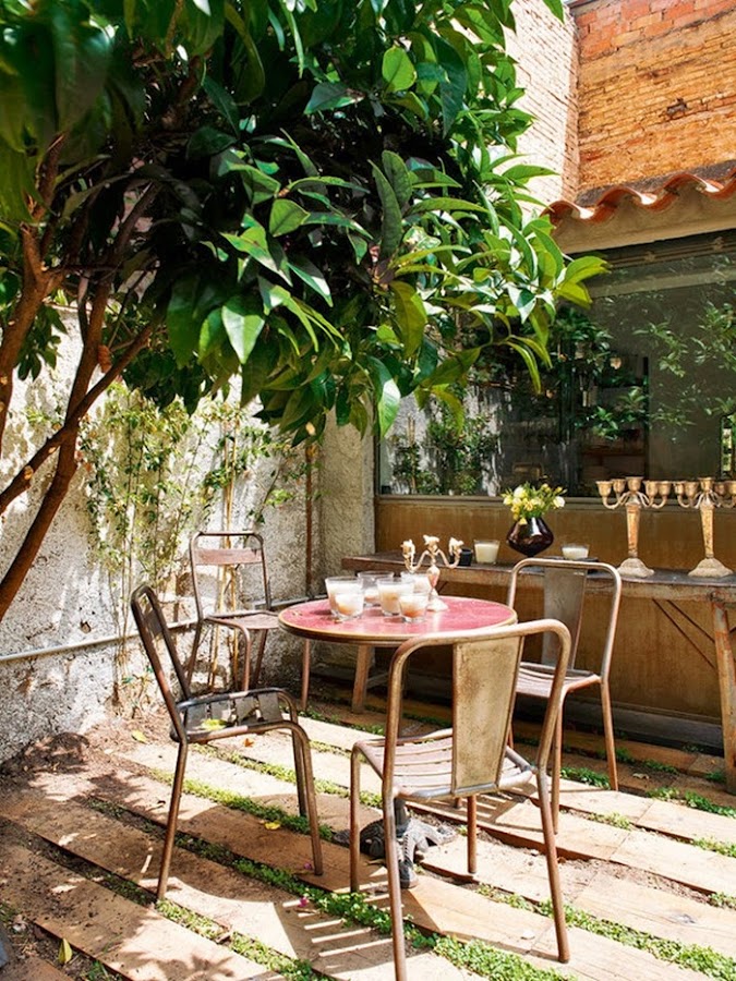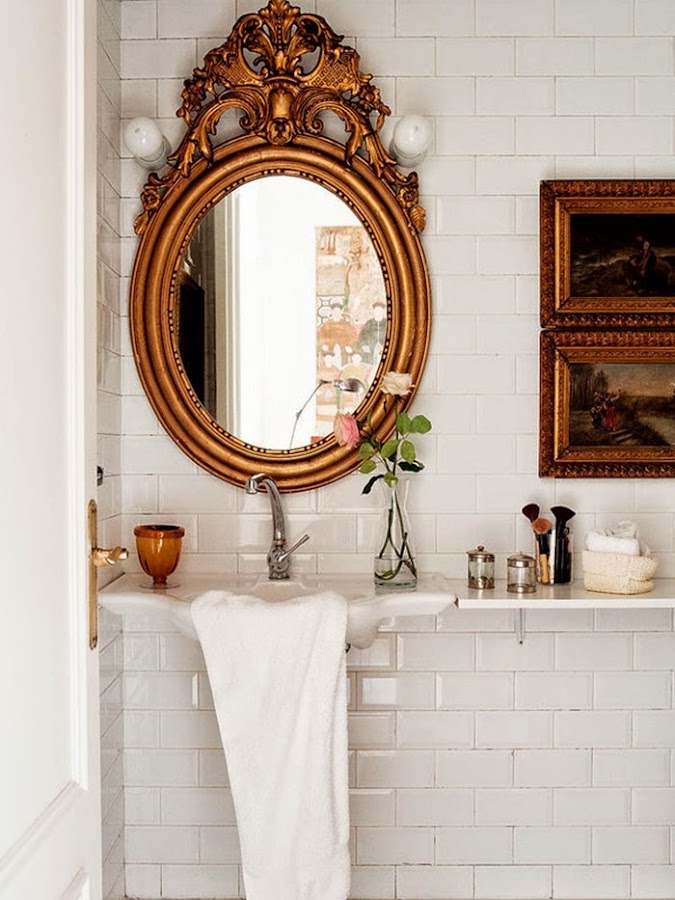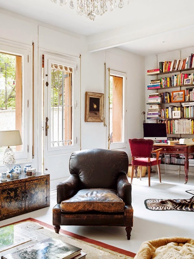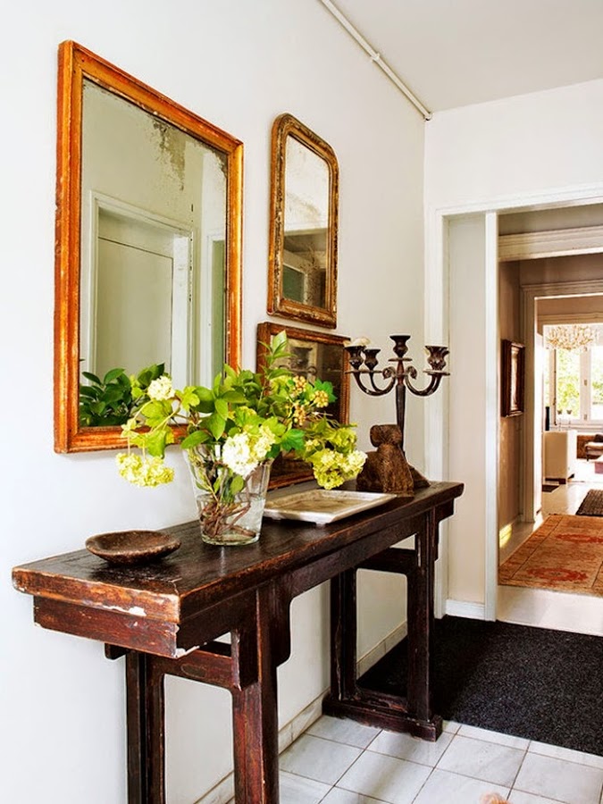 Con eso de que mi marido y yo estamos en plena movida con el jardín, removiendo tierra, poniendo traviesas y pensando en plantar la hierba, estoy un poco cansada de tener mi porche patas arriba, :( El caso es que ha sido ver este rincón y quedarme pegada al ordenador. No sé si han sido las traviesas del suelo por donde asoma la hierba, los sillones fabricados con palets y textiles blancos, los faroles de aire marroquí.....o sencillamente que estoy en la fase "necesito acabar mi jardín ya", el caso es que me ha encantado este rincón lleno de inspiración. Ideas sencillas y piezas especiales que crean un espacio de lo más acogedor. Y aquí no acaba la cosa, si pasamos al interior de esta vivienda.....wow, "deco" de estilo ecléctico, piezas de herencia familiar, algunas de coleccionista, otras vintage, una base de color blanco y detalles de look retro, en resumen un MIX de funcionalidad y glamour.......en fin, mires donde mires se respira el buen gusto. Yo me he quedado fascinada con los espejos antiguos de la entrada, la lámpara de lágrimas, el puf de pelo y el sillón de cuero del salón. Por no hablar del espejo sol del comedor y el del baño que me vuelven loca, de la cómoda de la habitación......¿veis de lo que os hablo? Os recomiendo que miréis con calma cada foto, en cada espacio hay algo que descubrir......