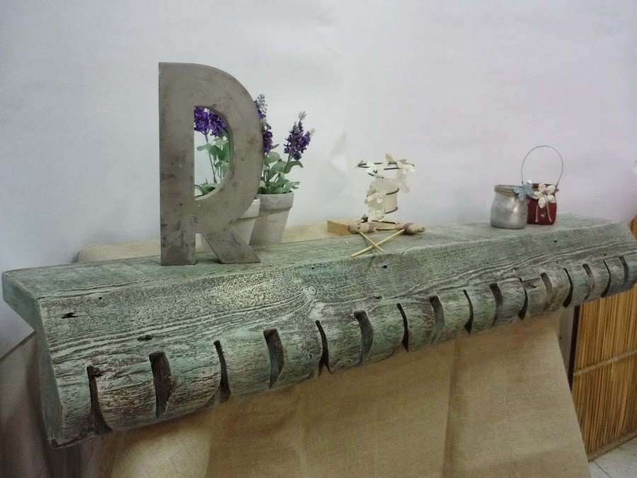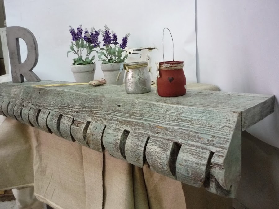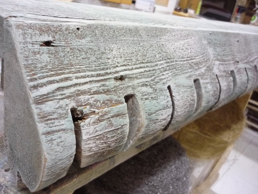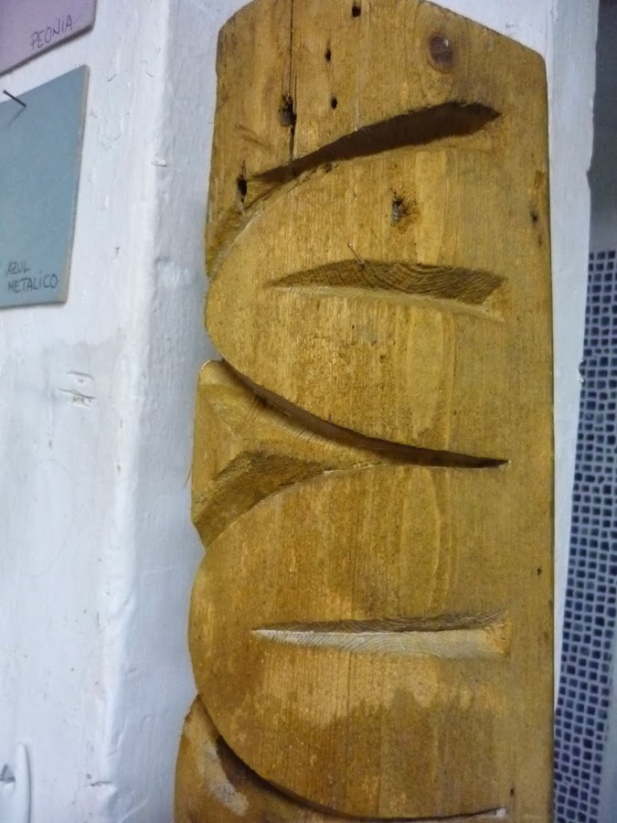 Al examinar la pieza vemos las marcas de las herramientas, está tallada a mano y se nota la maestría con la gubia al hacer esta especie de gallones, muy típicos del norte. Las medidas son perfectas para una consola porque tiene muy poco fondo, tan poco que tuvimos que añadirle un listón para darle algo más.