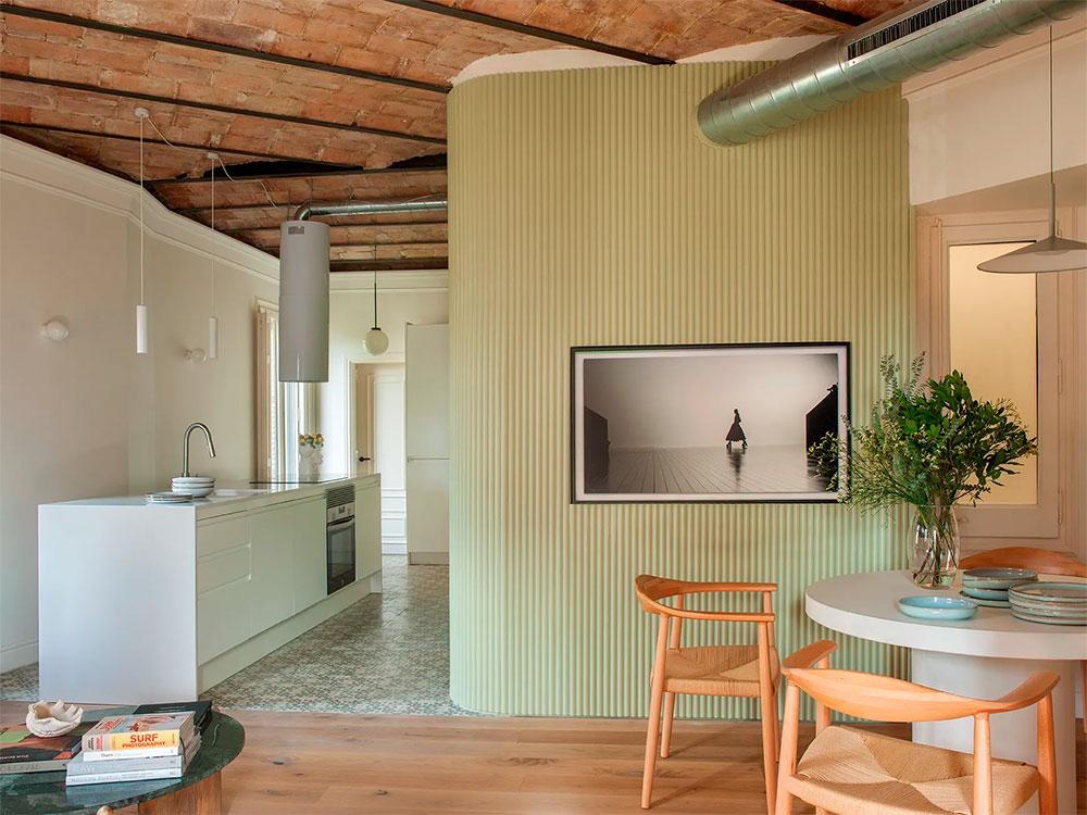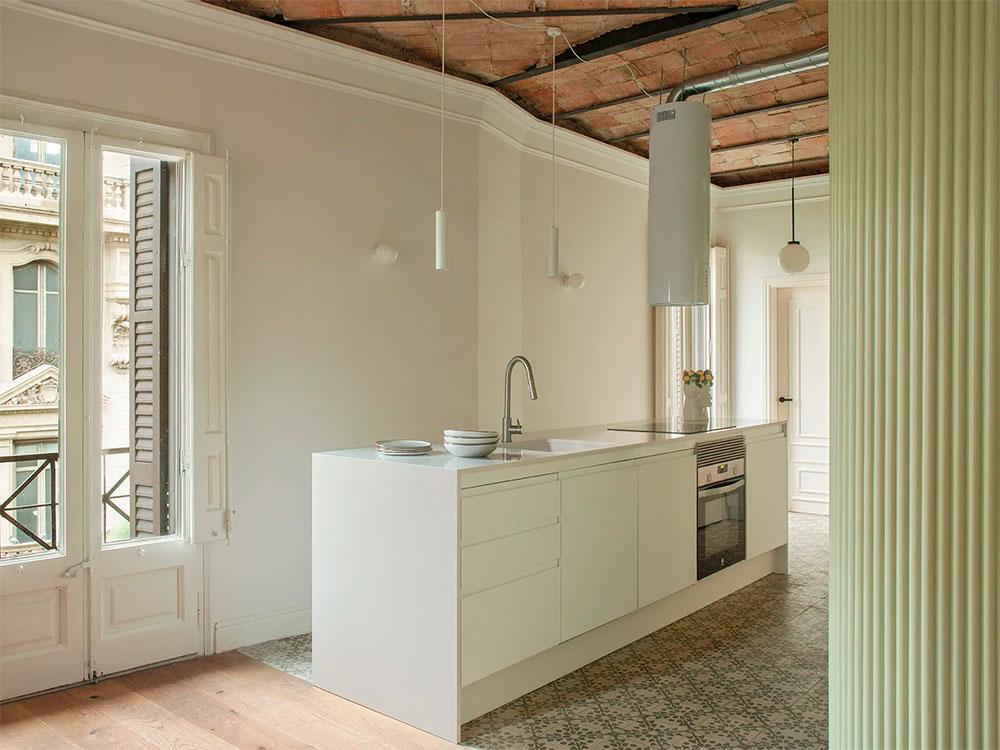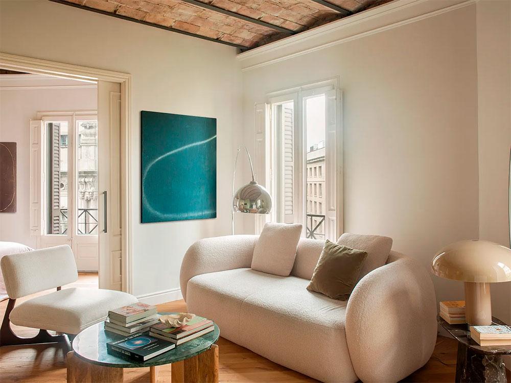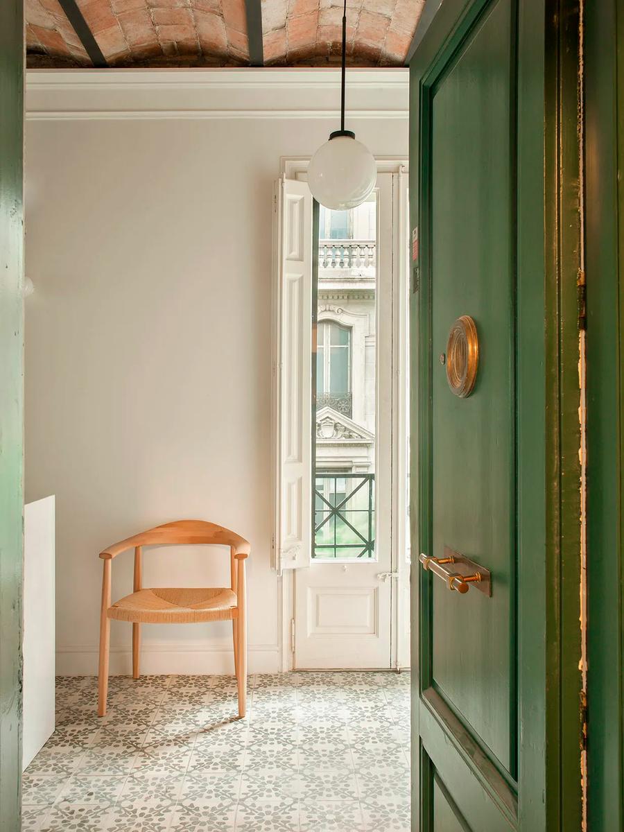 El respeto por los elementos originales fue clave en el diseño. La volta catalana en el techo, las molduras clásicas y el suelo de madera natural combinado con baldosas hidráulicas rinden homenaje a la historia del edificio. Su propósito era conseguir que al entrar en la vivienda el estilo reflejara que se encontraba en la ciudad condal, además de que llevara su esencia, creo que lo consiguió con creces.