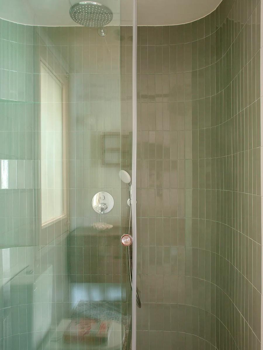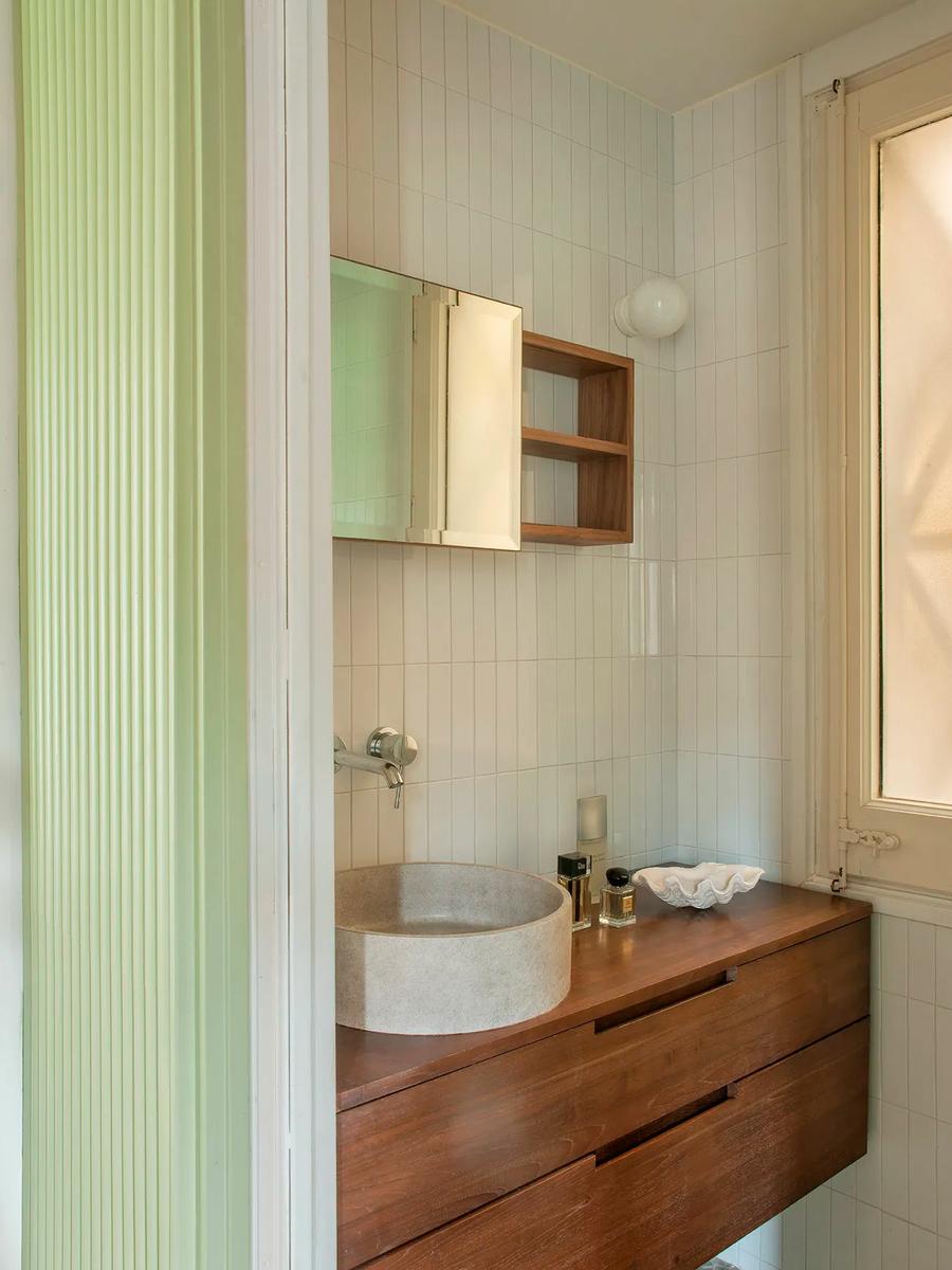 En el baño, el verde menta aporta frescura y refuerza la conexión con la naturaleza. Las ventanas originales se restauraron para conservar el carácter del edificio, mientras que el mobiliario combina piezas funcionales y atemporales, como el sofá Martina en beige de Kave Home o la mesa de centro de The Masie.