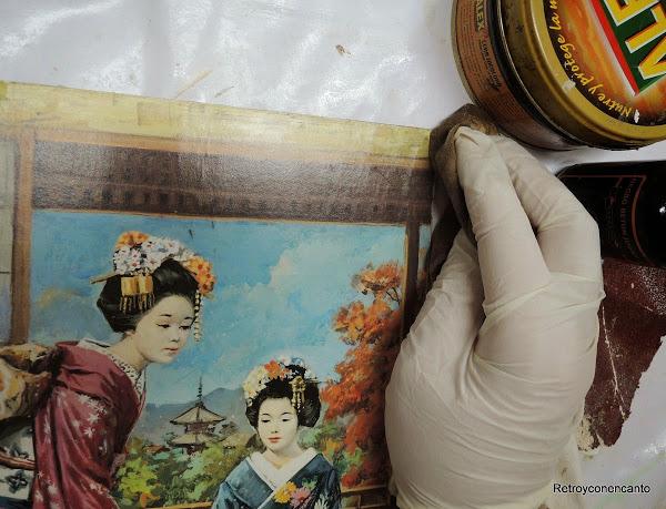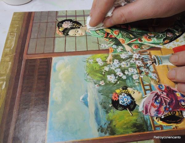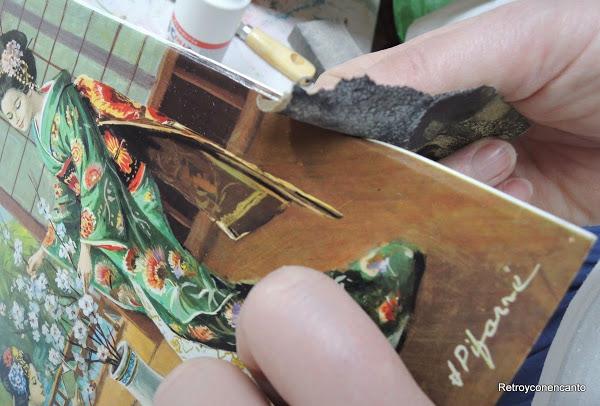 Nosotras siempre empleamos cola Stamperia, especial para este tipo de trabajos, tanto para adherir las láminas como para protegerlas al finalizar. Pero, siguiendo los consejos de nuestra buena amiga Lola, de El refugio de Lirtea, esta vez aplicamos varias capas de barniz mate para la terminación, ¡y estamos encantadas con los resultados!