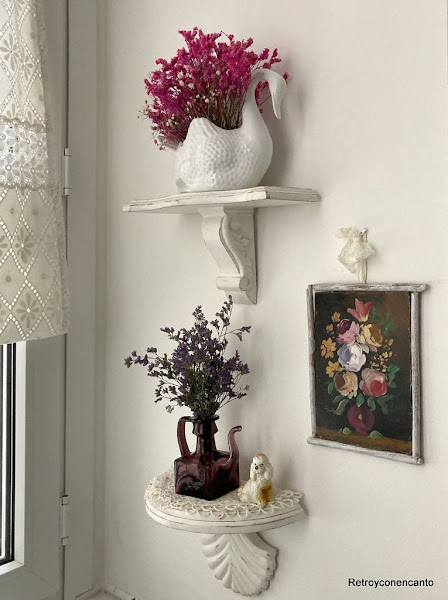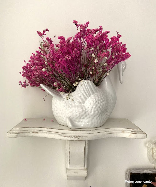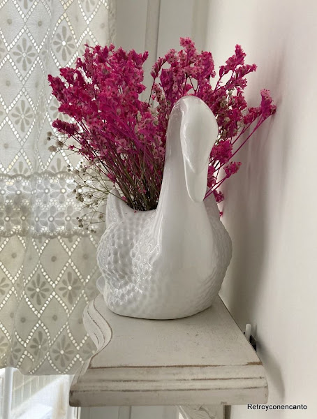 Colocar estas flores secas nos ha parecido una bonita apuesta para el cisne vintage, y para decorar con algo de Naturaleza este pequeño espacio.