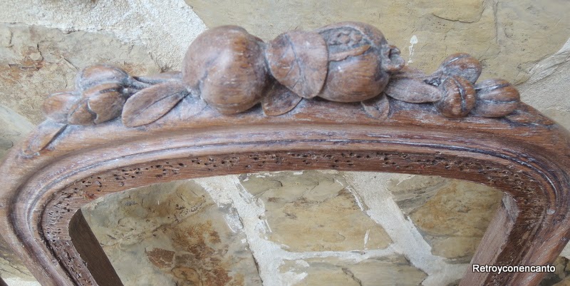 Después de desmontar la tapicería, comenzó el trabajo que, básicamente, consistió en lijar con mucho cariño cada recoveco de ese precioso tallado, hasta dejar la madera en su color natural. Fue entonces cuando aparecieron algunos signos inequívocos de carcoma que procedimos a tratar.