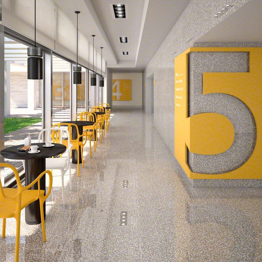 Seguramente, cuando hablamos de este tipo de materiales, nos vienen a la mente los suelos de edificios construidos hace unos 20 – 30 años, y ésto es debido a que durante las buenas épocas del sector de la construcción, el terrazo fue un material muy popular debido a su dureza y resistencia, ya que permitía además, tabicar encima suyo, con lo que los constructores ganaban mucho tiempo en la colocación, pudiendo construir los tabiques a posteriori sin dañar absolutamente nada la superficie del material, el cual, con una pulida al finalizar la obra , quedaba realmente brillante y en perfecto estado.