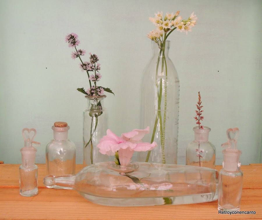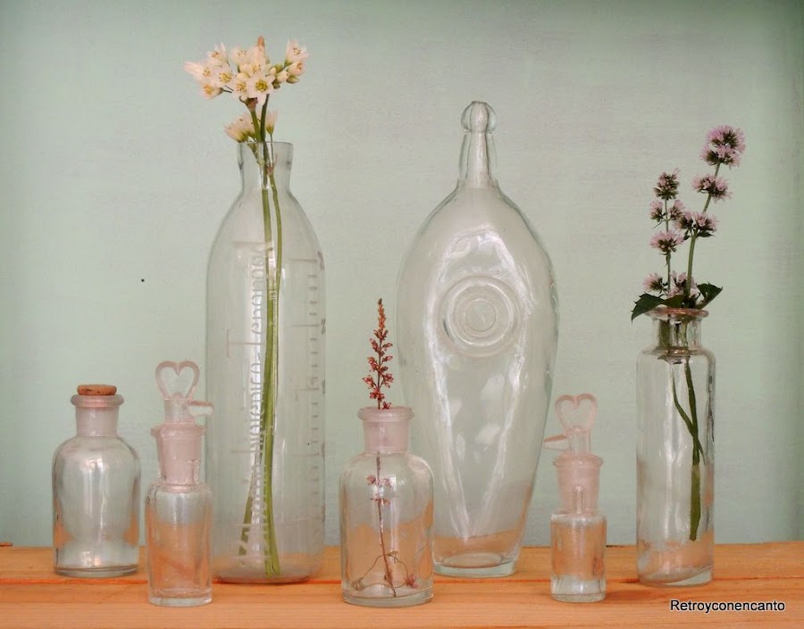 Se nos ocurrió hacer un bodegón con los recipientes de cristal vintage, muchos de ellos antigüedades por tener más de cien años, que poco a poco hemos ido consiguiendo, y todos relacionados con el mundo de la farmacia y el laboratorio.