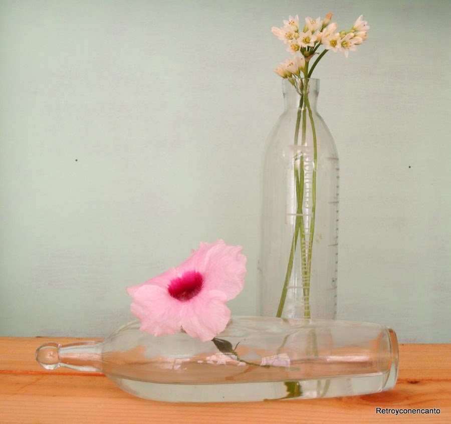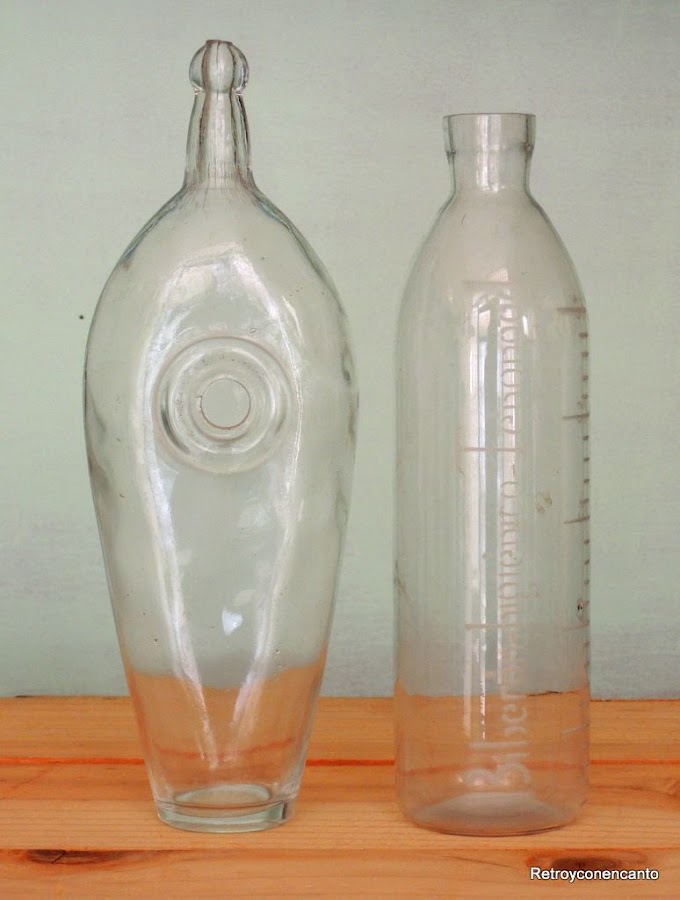 Y no es que venga un bebé de camino... El hermano mayor de una de nosotras también está muy implicado en eso de proveernos de material vintage. Así, cada vez que tiene un derribo o una reforma en la que existan elementos decorativos que vayan a ser desechados, nos envía fotos previas por si nos interesa; ya atesoramos un par de lámparas a las que algún día meteremos mano... El último aviso que nos dio se refería a biberones de cristal... Sí, sí, biberones de un antiguo almacén farmacéutico que iban a desmantelar. Ambos modelos datan de principios del siglo pasado, y confesamos que el de la izquierda no lo habíamos visto en nuestra vida...