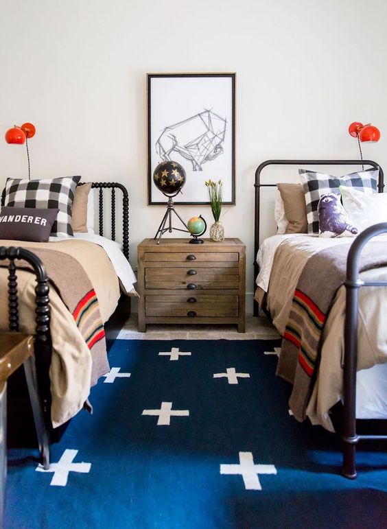 7. En habitaciones más grandes otra disposición a tener en cuenta es el de las camas en ángulo. Esta fue la primera opción que barajé para la habitación de mis peques, si no fuera por un pilar de la esquina. Esta forma de colocar las camas deja un espacio “muerto” en los cabeceros, que puedes aprovechar para colocar un arcón de almacenaje y estanterías.