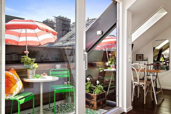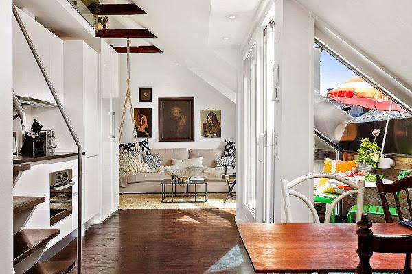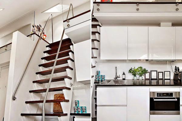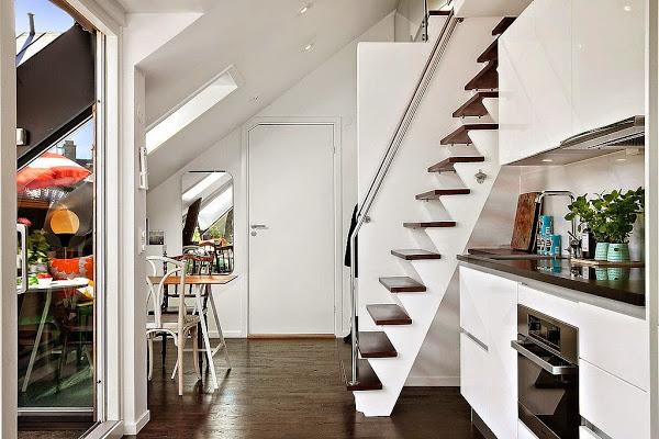 El espacio social queda completamente abierto y situado frente a los ventanales de entrada de luz y salida a la mini terraza, aprovechando la claridad que aporta y quedandando la distribución en linea que crea sensación de amplitud. La cocina ( con muebles totalmente integrada en blanco ) queda en zona de paso frente a la mini terraza para aprovechar las vistas de color y verde, y se une en ambos extremos con la zona de salón-estar y por el otro lado, con el comedor de aire vintage con piezas recuperadas. Con una escalera que aprovecha el máximo el espacio al estilo de las escamoteables pero en peldamos de madera como el solado, accedemos a la zona de dormitorio.
