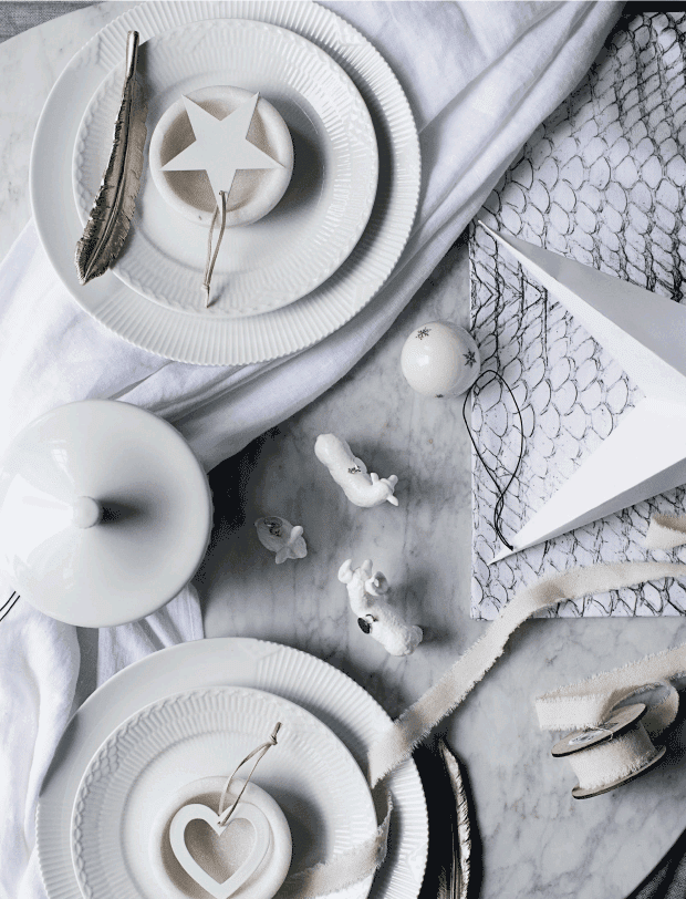 3- PALETA EN BLANCO: el color blanco y la Navidad, difícilmente se pueden disociar. Una mesa de Navidad en blanco expresa pureza e inocencia, y es hermoso y simple al mismo tiempo. El blanco es el color donde se reúnen todos los colores, es uno de los consentidos en la decoración navideña debido a su simbología y a la vibración que este color emite: elegancia y luminosidad. Mezcla la porcelana con otros materiales blancos como el mármol gris-blanco, ropa y otras texturas mixta.