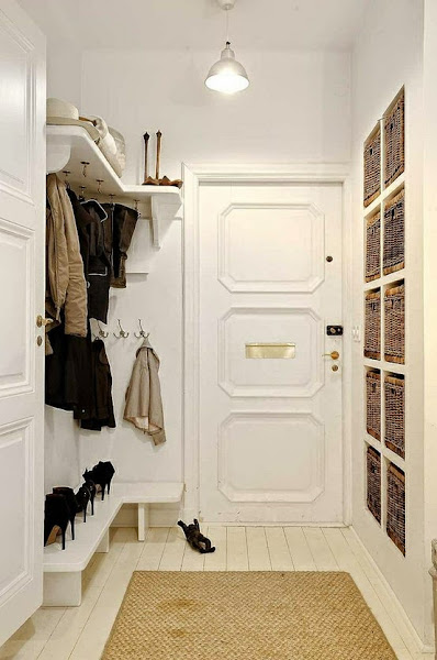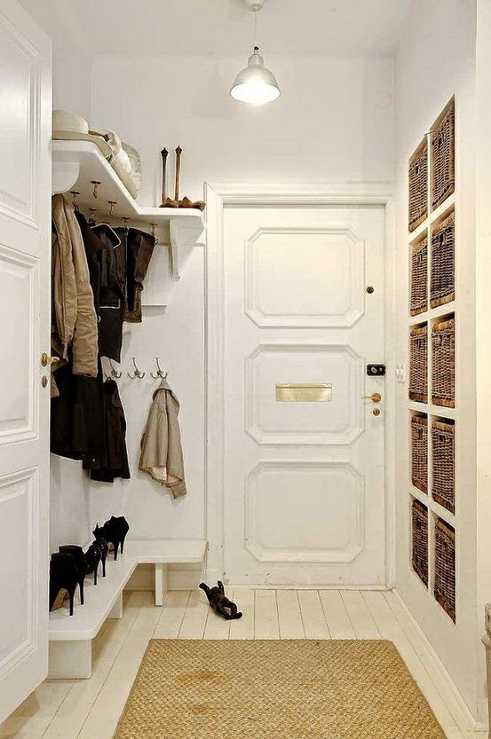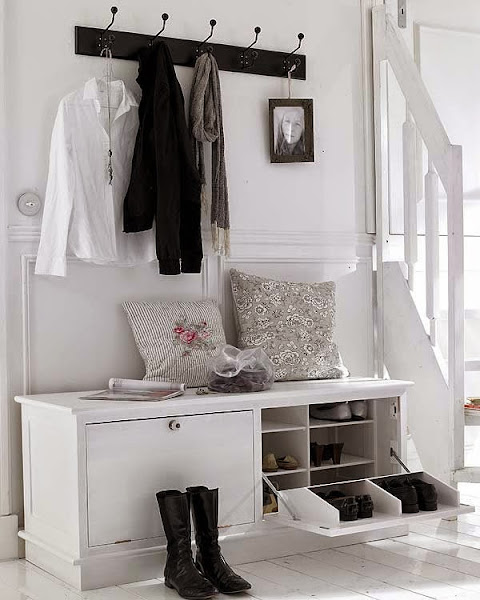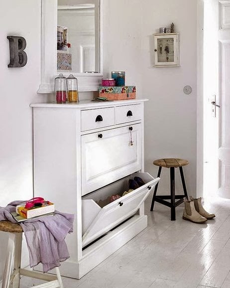 En zonas con un clima húmedo y si tienes espacio de recibidor amplio, no está de más incluir un zapatero donde dejar el calzado mojado nada más llegar y rescatar las zapatillas. Con ello, además de evitar que el suelo se manche de barro, sentirás la agradable sensación de estar por fin en casa. Si no se tiene un mueble o elemento "contenedor" para dejar los zapatos, el espacio puede convertirse en un rincón caótico y desordenado. Escoge un mueble con varios módulos irregulares, que no sea muy profundo, pues así habrá más espacio. El módulo puede estar abierto pero yo os aconsejo que lo elijáis con puertas que tapen de la vista el zapatero. No olvides incorporar un pequeño asiento y una alfombra mullida y cálida de pequeñas dimensiones. Para dar un aspecto más estético y elegante, a la vez que práctico, puedes poner una butaca o asiento tipo banco. El zapatero, además hará las veces de consola en caso de no tener espacio para ella, aprovechando su tablero superior. Podría hacernos la misma función: anotar cosas, colocar el correo, posar objetos que no queremos olvidar, y también servirnos de espacio decorativo, incorporando jarrones de flores u otros objetos para embellecerlo.
