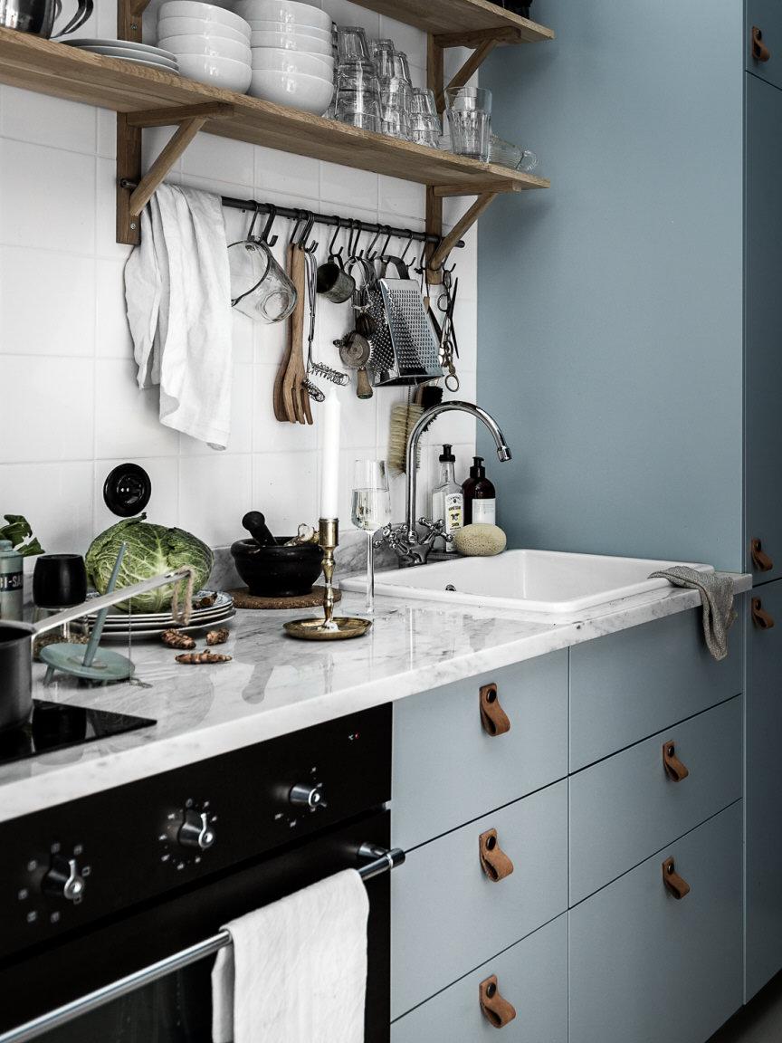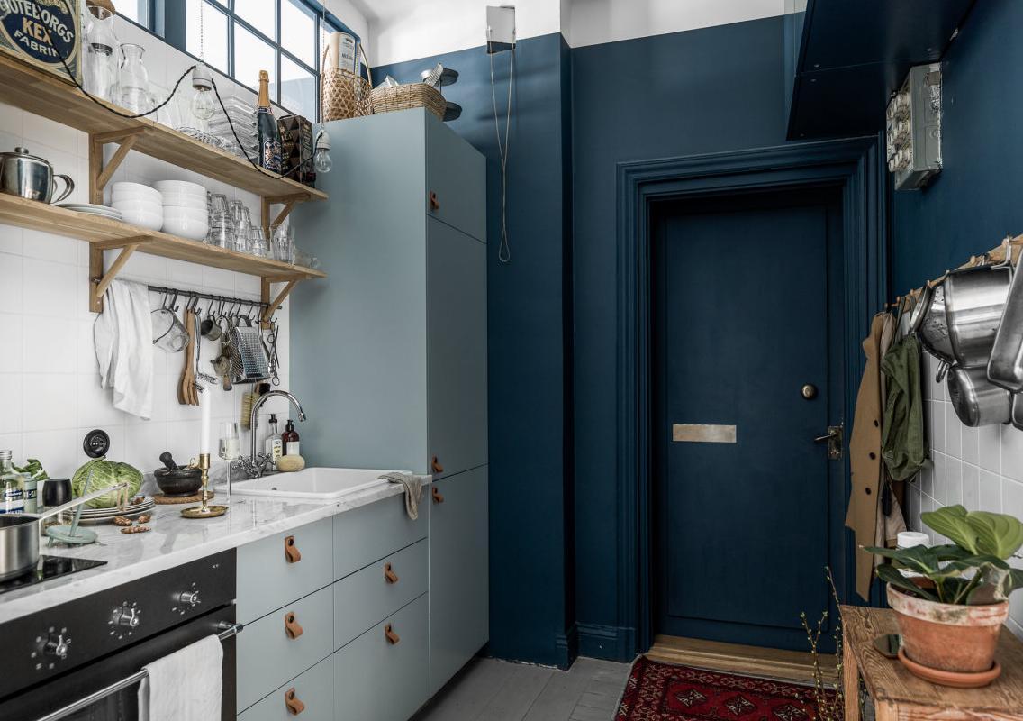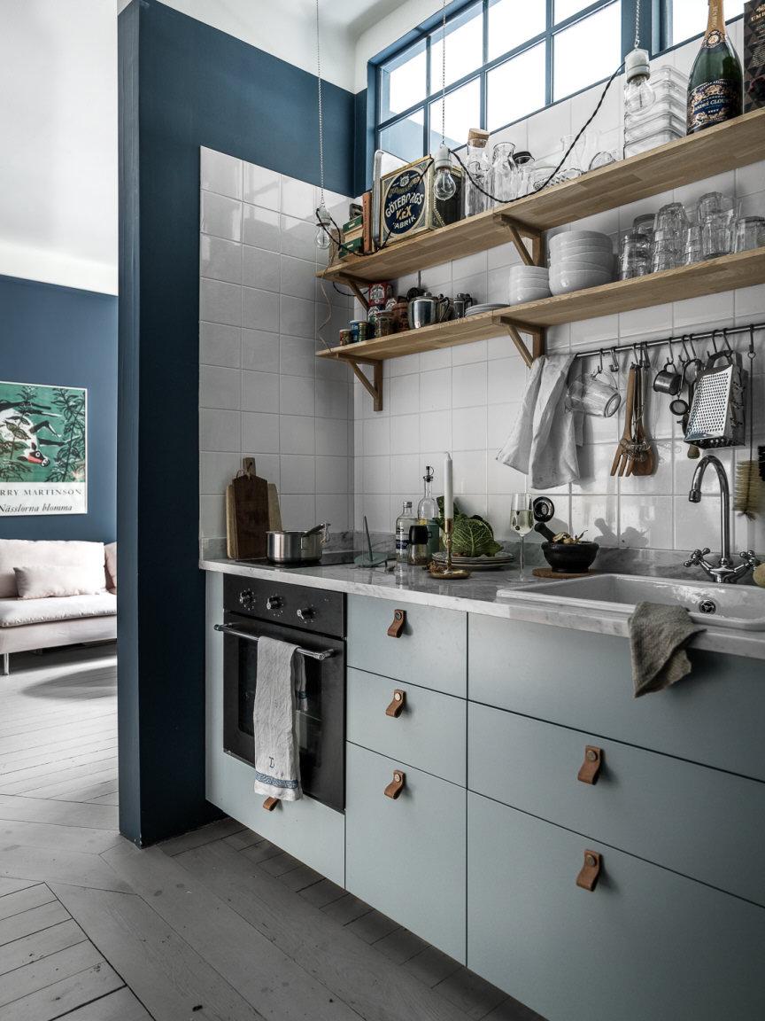 La sensación de volver a casa y sentirse ‘abrazado’ por la calma de este interior en medio de la gran ciudad es lo mejor. En la zona de estar salón, el solado se ha pintado en blanco para crear una sensación de amplitud y profundidad en contraste con el azul oscuro. Muebles de bambú, madera clara y lámparas de diseño retro, completan la decoración. La cocina es uno de los espacios que más me gustan. Un diseño de contraste que nos retrotrae a la cocinas de antaño, nórdica con las baldas vistas, azulejo cerámico 20×20 y los muebles en color mint con tiradores de cuero ideales.