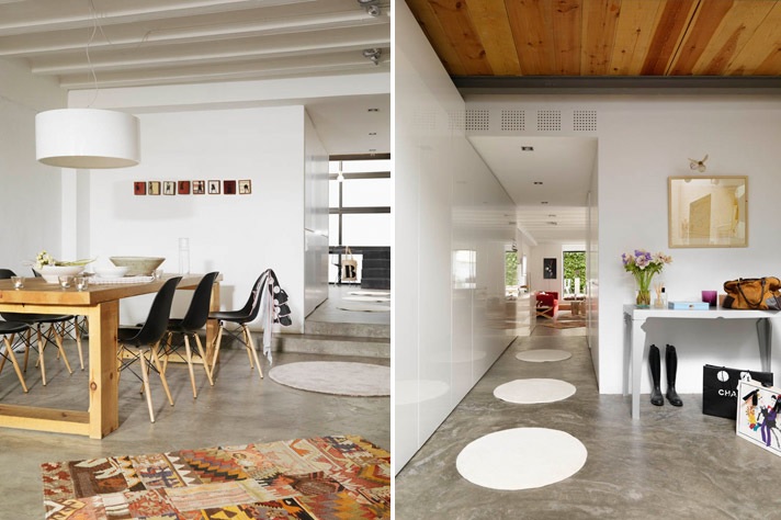 El techo de bovedillas cerámicas vistas y pintadas en gris, como una prolongación del paramento vertical, crea una sensación de amplitud y luminosidad a todo el conjunto. A priori puede parecer un espacio frío con el suelo de microcemento y las estructuras vistas pero con los complementos, piezas de mobiliario y las texturas de colores dan otra sensación.