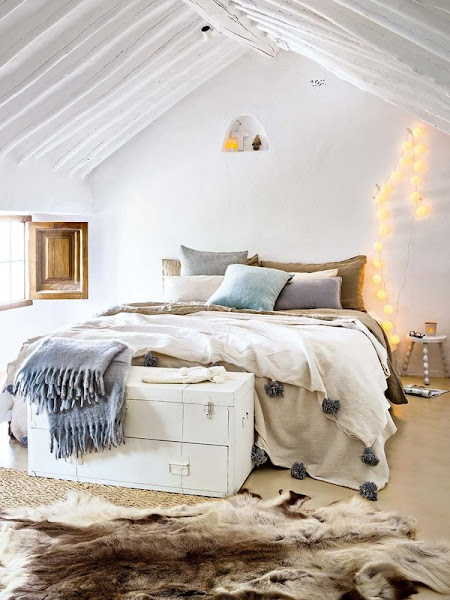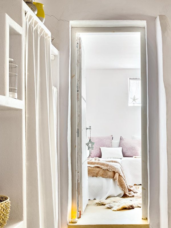 El dormitorio principal se sitúa en el piso de arriba bajo un techo a dos aguas y puertas, vigas y escalera, se pintaron también en blanco para que los muebles fueran los protagonistas de las estancias. Se crean pequeños espacios con una atmósfera llena de encanto y calidez.