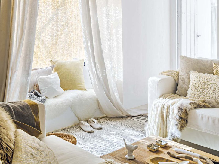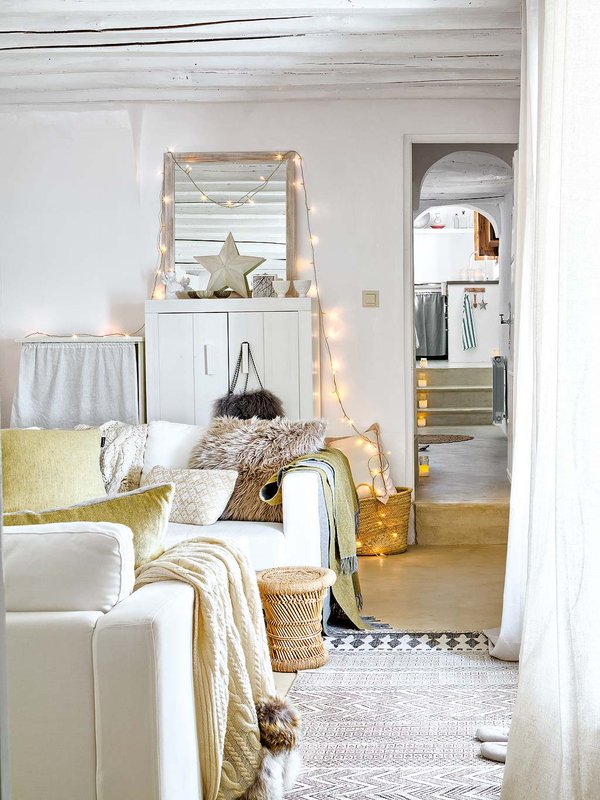 Con un cierto toque de estilo inglés, la casa de 1945 se plantea en una paleta de color completamente en blancos y colores neutros muy claros, para ganar en luminosidad y amplitud. Su diseñadora e interiorista, Ana Fernéndez, plantea un espacio abierto con una cocina office abierta y comunicada con la zona de estar, donde el color simplemente, delimita cada zonificación y espacio. El suelo en cemento pulido le da continuidad a toda la vivienda con ese toque tan industrial rústico que a mí tanto me gusta, y el contraste perfecto a techos y paredes en blanco brillante. Muchas de las piezas de mobiliario se han recuperado dando un sutil toque vintage a un espacio de marcado estilo rústico. La zona de estar resulta un rincón especial y acogedor alrededor de la chimenea. En la cocina, los muebles de obra con cortinilla nos recuerdan a las casas de pueblo de nuestras abuelas.