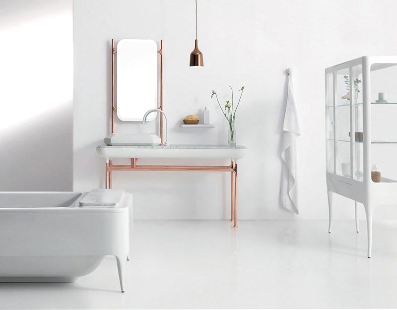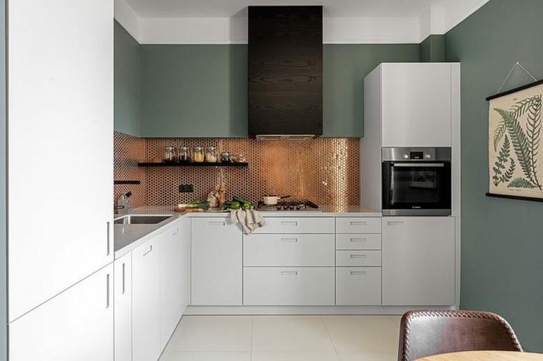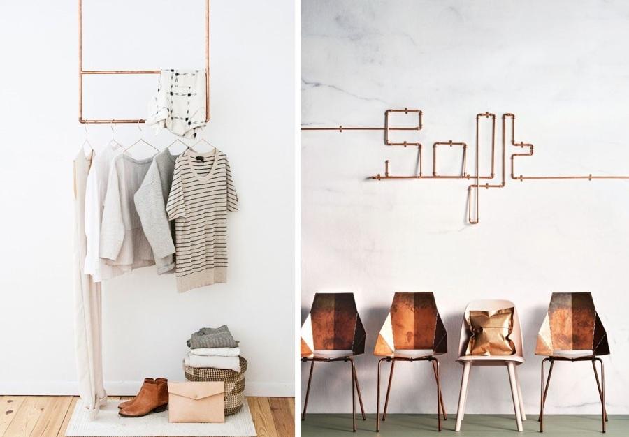 A la hora de diseñar baños y cocinas, este material es de lo más frecuente. Utilizado en griferías o menaje de cocina, también puedes usarlo en paredes como revestimientos, o puertas. Una original opción es elegir toda la fontanería de cobre y dejarla a la vista, decorando con ellas las paredes del baño. De esta forma le darás un toque industrial y divertido a este espacio. Es muy recomendable para usarlo en la cocina ya que no se oxida y previene la acumulación y propagación de bacterias.