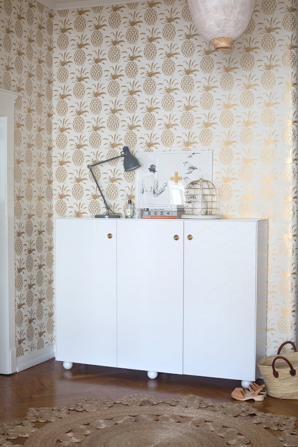 Está claro que primero hay que buscar un objeto que sea el punto de partida para decorar todo el espacio, en este caso es el precioso papel pintado de piñas. Si buscas algo más sobrio, ya hicimos un post sobre un recibidor que quizás te pueda ayudar, lo puedes ver aquí.