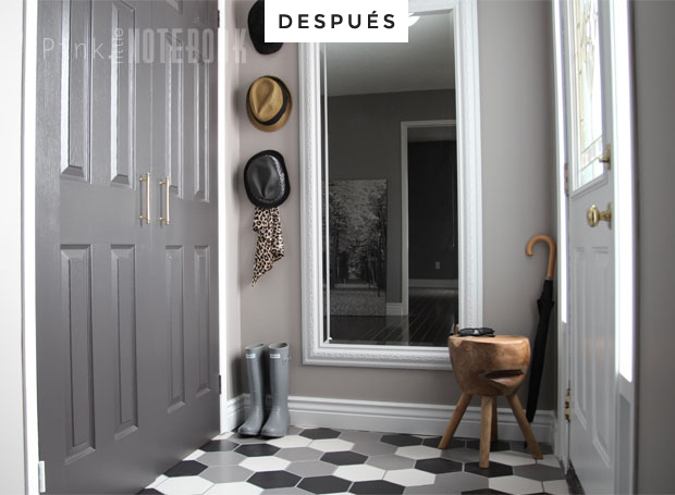 Un par de pinturas en tonos grises, un espejo, un nuevo suelo (eso sí es más costoso, y ni loca me atrevería hacer), dos cositas para decorar y menudo recibidor más chulo!
