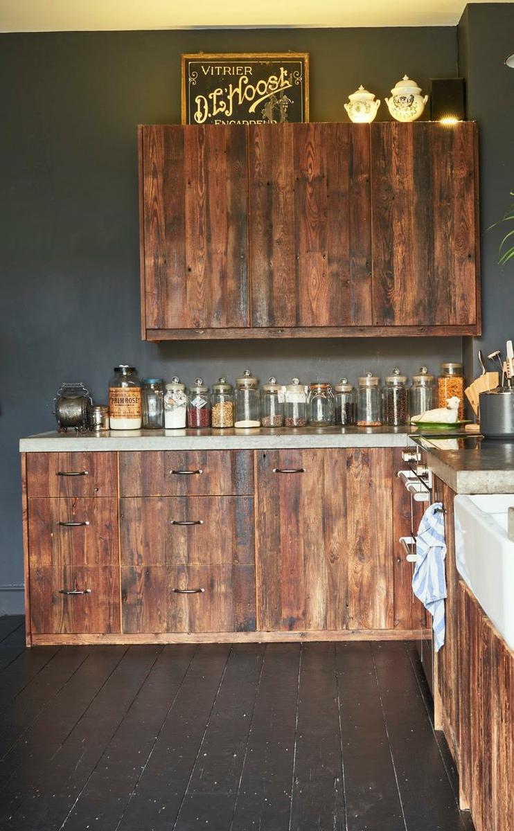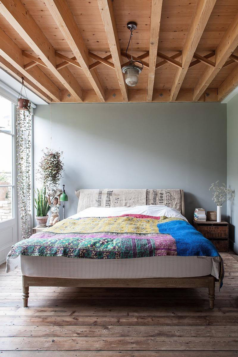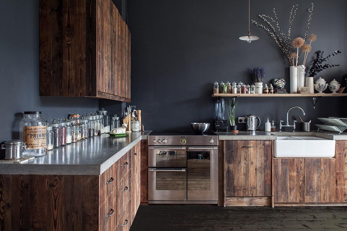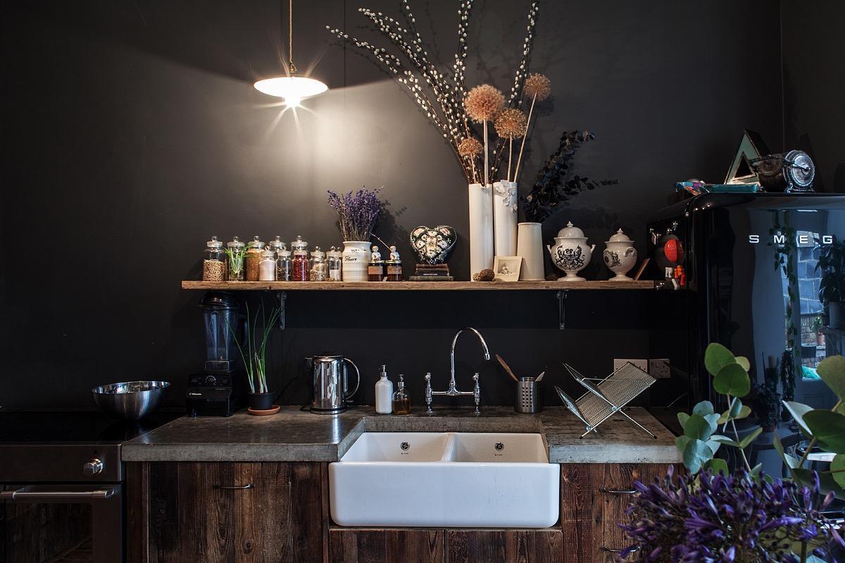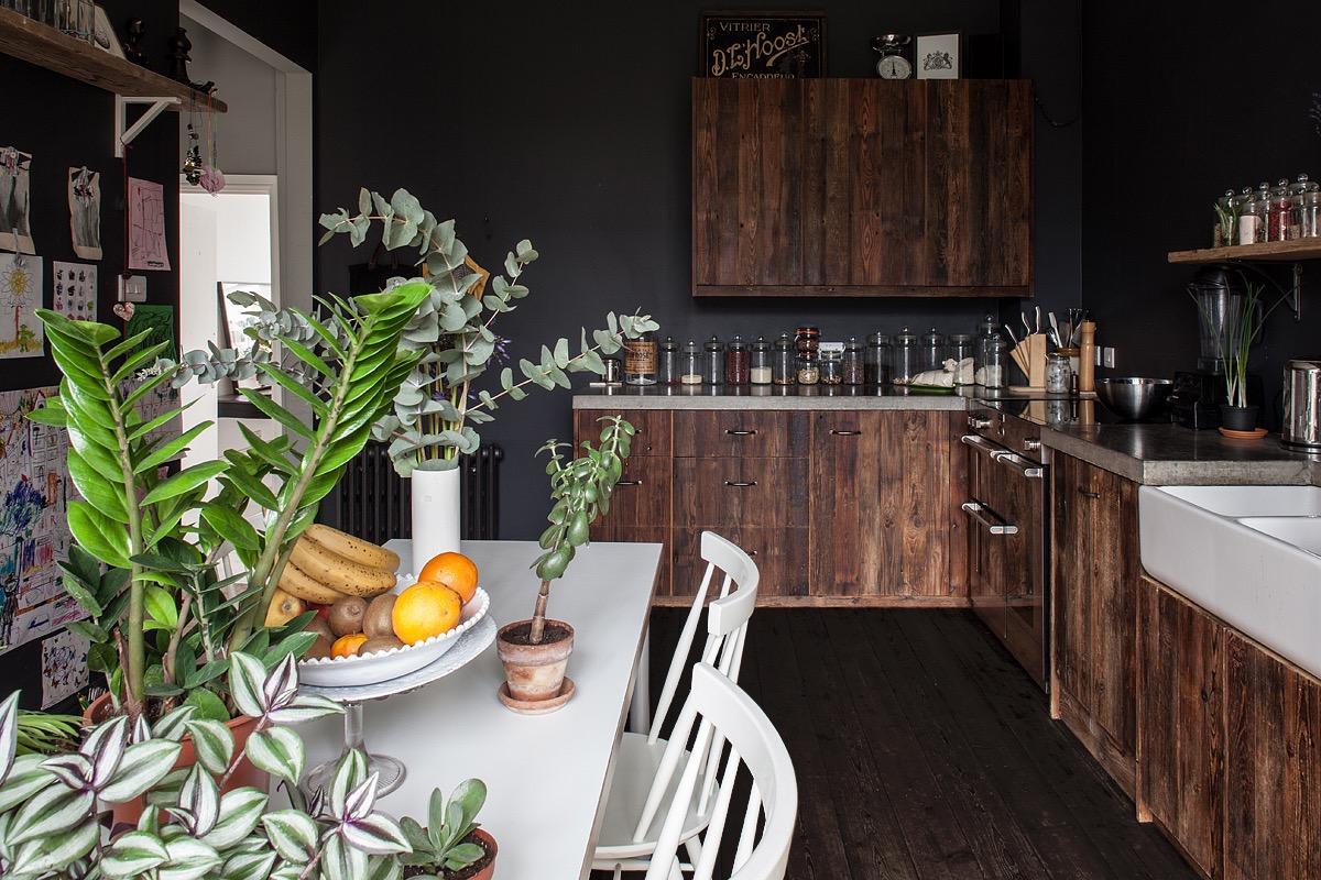 Un estilo libre, que no sigue patrones predeterminados ni normas, donde su originalidad y esencia radica en que puedes mezclar todo tipo de elementos con cierta despreocupación. Por ejemplo, plantas colgantes, una maleta vintage como elemento que soporta la TV, los cajones de madera como mesillas, etc. Se crea así un diseño cálido y personal. El uso del color negro en la cocina, le confiere mucha fuerza y contraste con la madera nudosa rojiza utilizada en los muebles y elementos de almacenamiento. La encimera de hormigón, la mesa y sillas en blanco y el fregadero, aportan la luz y el punto focal a esta estancia.