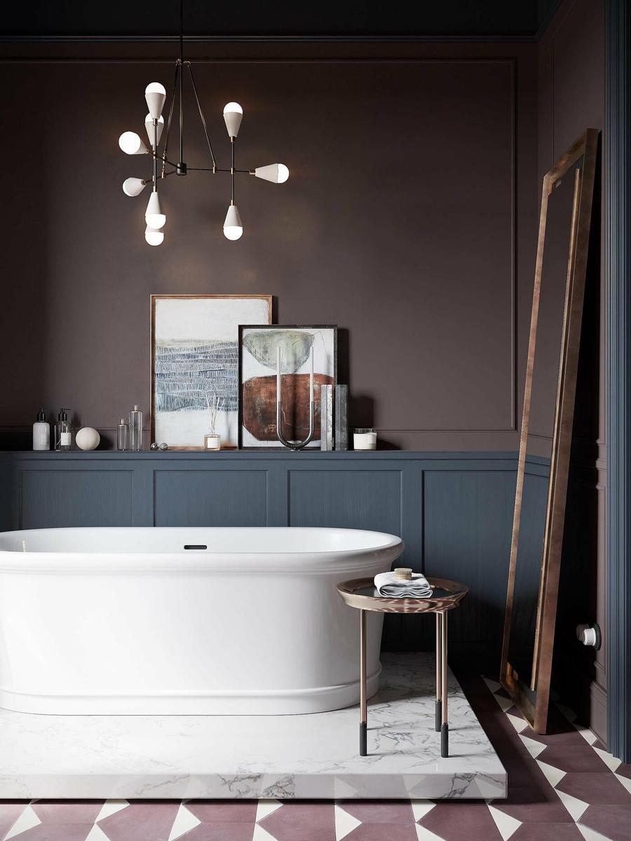 Con reminiscencias que nos recuerdan a los espacios de las películas y las estrellas de cine de los años 20 y 30, el baño trasmite energía y elegancia. Destaca su paleta de color fuerte y personal con tonos grafito, café y burgundy, en fuerte contraste con el blanco cerámico de las piezas principales y el mármol de la base de la bañera.