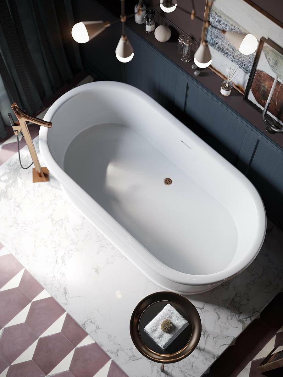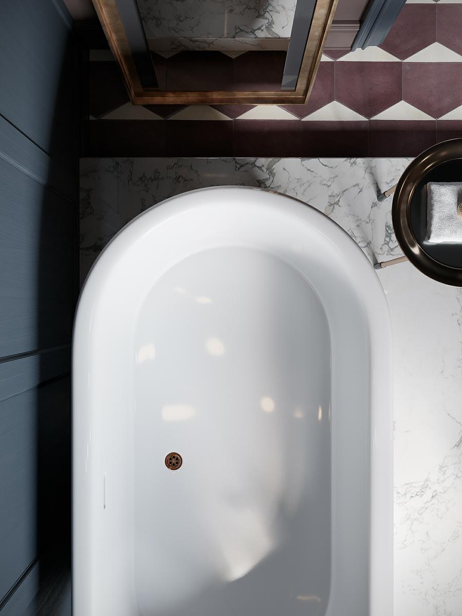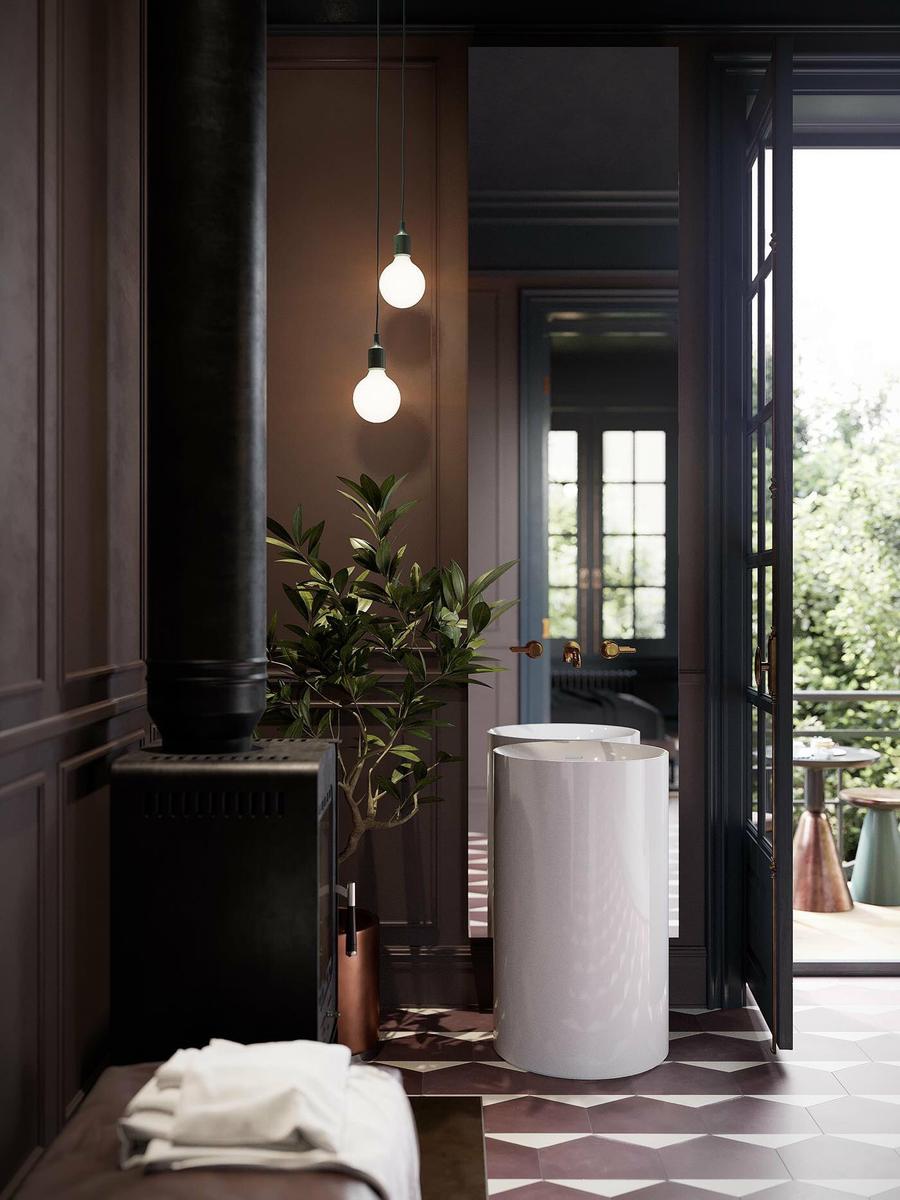 El uso de elementos metalizados, darán brillo y amplitud al baño. Se trata de un ambiente lleno de sofisticación pero con un punto de clasicismo elegante. La bañera exenta y el lavabo en forma de tubo de una sola pieza, son esculturas en sí mismas, con una grifería de diseño en color cobre brillante, que maravilloso. El juego con los espejos, el de la pared del lavabo y el apoyado en el suelo de la zona de bañera, juega a dar amplitud al conjunto (más si cabe) y a reflejar las piezas y la luz. Los detalles aportan el toque final a este diseño que cuenta con una lámpara de bombillas Led desnudas a modo de racimo, una mesa auxiliar metálica, láminas apoyadas en la pared, una chimenea y un banco chaiselongue. El solado hidráulico con motivo geométrico aporta calidez y el zócalo de madera que rodea la zona de baño, enmarca el rincón de relax.