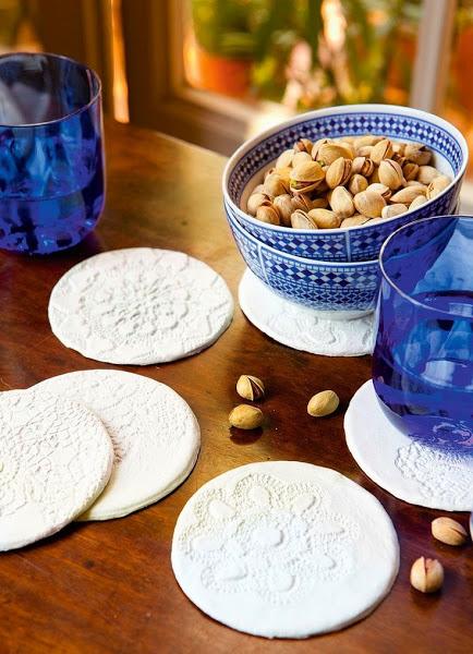 Estos Posavasos de la imagen de arriba están hechos con arcilla blanca, luego se pone un tapete de crochet encima se aprieta fuerte hasta dejar el dibujo marcado y sólo hay que dejarlos secar. Para el resto de los tutoriales pinchar en los enlaces que hay debajo de cada fotografía y os llevaran hasta las páginas de los autores...y si os quedaís con ganas de más ideas...en Pinterest encontrareís miles...