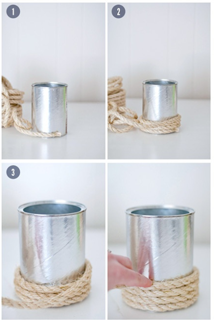 pues una simple lata de conserva, un bote de cristal y un poco de cuerda de esparto para convertirse en un estupendo florero ... a continuación comparto las imágenes del paso a paso...ya veís que fácil, rápido y resultón queda este florero.