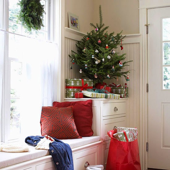 6- Aprovechas las esquinas: rincones, baldas, estantes, librerías, todas son excelentes lugares para esta decoración festiva. Si no hay espacio para un árbol lleno, ponga una versión mini en un estante a media altura. En lugar de las luces, decora con adornos de pequeña escala como en la imagen y será el rincón de Navidad perfecto.
