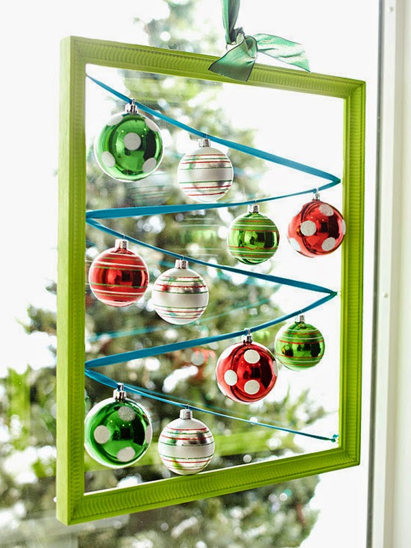 3- Crea un Escaparate Colgante: para que se vea a través de la ventana y desde fuera. Es tan sencillo como coger un marco pintado en un color único sujeto a la ventana con un lazo yen su interior colocar una cinta de decorativa de regalo enganchada a modo de zig zag a los lados y metiendo bolas de distintos diseños y colores. Sencillo y muy resultón.