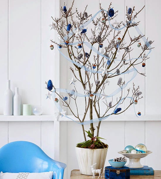 10- Decora tu planta natural: Dale un toque natural a la decoración navideña haciendo un árbol único a modo de maceta, en una tonalidad. Cubre tu "árbol" con cintas translúcidas y cuelga los adornos de las ramas.