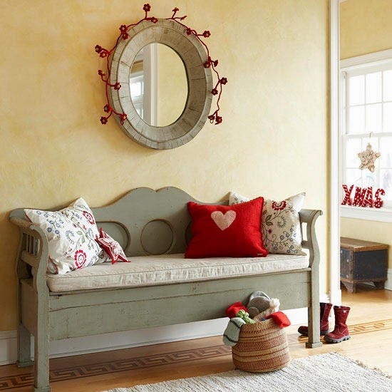 7- Anima la zona de entrada: el espíritu de la Navidad debe sentirse desde la entrada con un simple guirnalda, estrellas, o unos cojines rojos, como en la imagen.