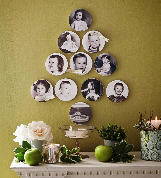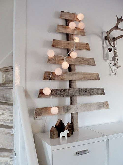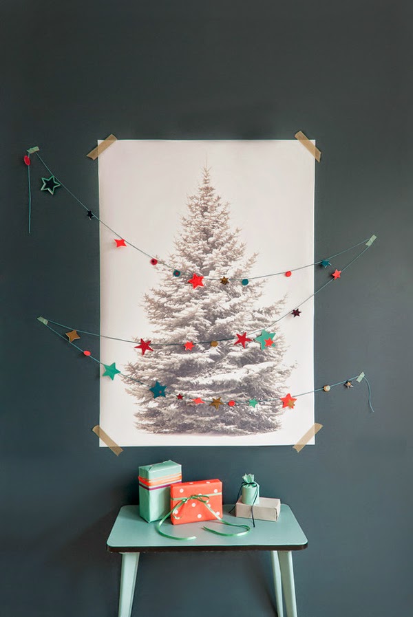 2- Árbol de Navidad de pared: Usa tiza para trazar un esbozo de un árbol en la pared. Decora con luces de cadena, utilizando diminutos clavos o tachuelas para colgar los adornos. Envuelve cajas vacías con papel decorativo para completar el efecto. ¡A que es Precioso!