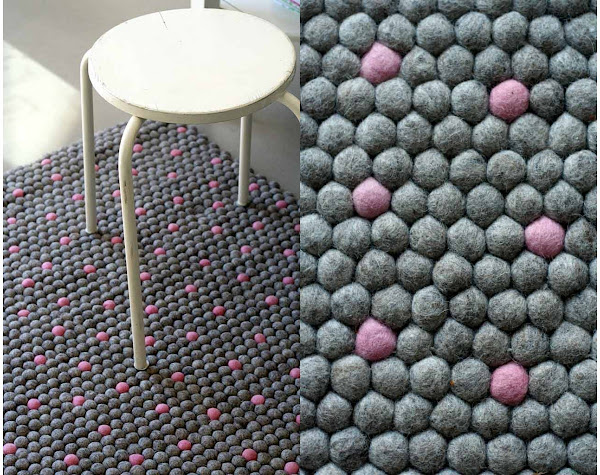 Para mi las alfombras de bolas de fieltro han sido un gran hallazgo. Las tienes rectangulares como las de toda la vida, o circulares. La forma de la alfombra dependerá de la zona para la que la quieras usar. Si te fijas en la foto de arriba, verás que abarca un pequeño trozo, y hace que la butaca y la cuna queden unidas por la alfombra. En cambio si lo que quieres es ponerla en un espacio más grande, como puede ser cerca del sofá para poder poner los pies y no tener que pisar el suelo, será mejor una rectangular.