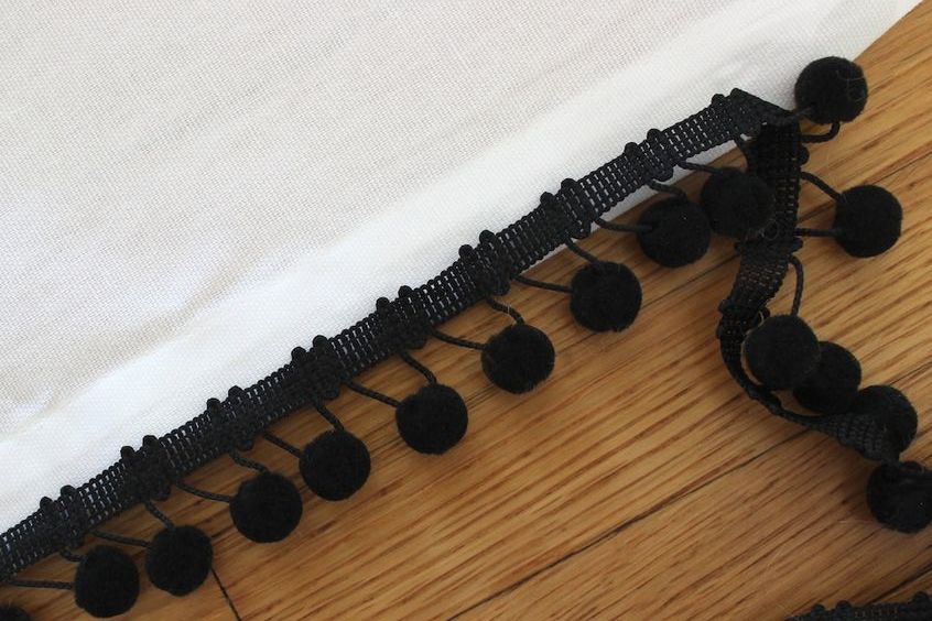 El caso es que no me apetece ponerlas lisas tal cual, sino ponerles algún detallito. Se me ha ocurrido que una buena idea puede ser personalizarlas con madroños o alguna guirnalda de tassels, pompones, etc. Algo que pueda poner de forma fácil y sin nociones de costura, simplemente con pegamento textil o con un poco de fliselina.